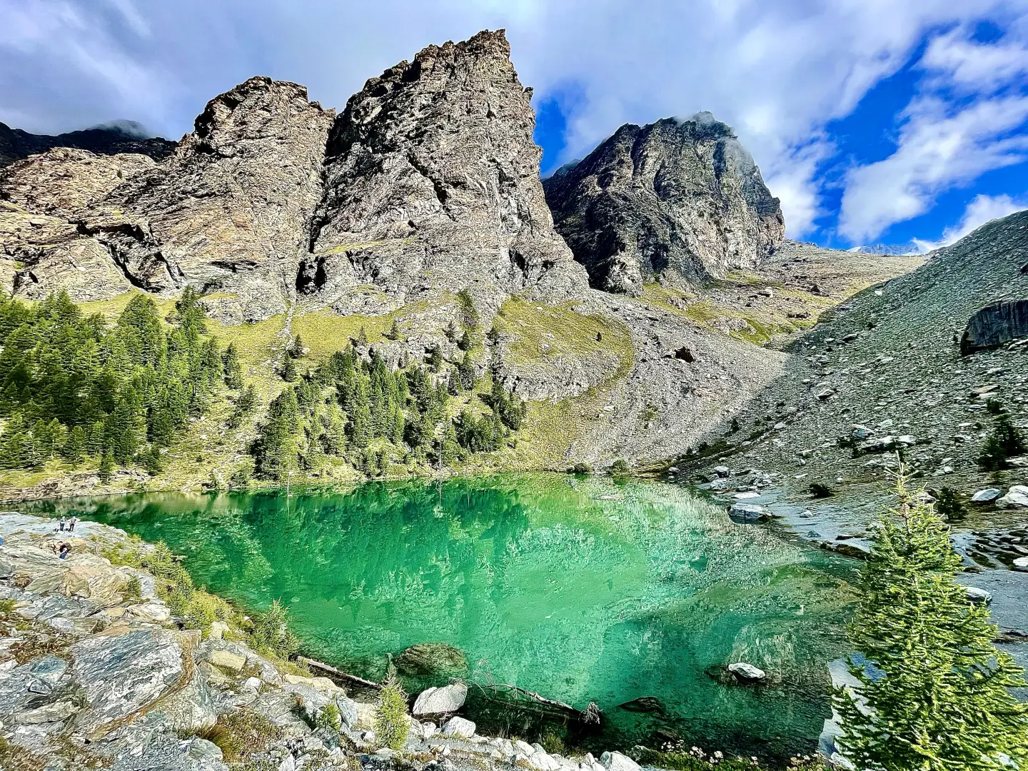 The trail continues along the right-hand path, crossing a clearing where the slender shape of the Don Bosco alpine house stands out on the right, a five-storey-high stone building that is a reminder of the tourism of yesteryear. Back in the forest, follow the path that climbs with a few steep bends and occasionally splits to rejoin a little further on; where the pavement is missing and the slope becomes steeper, the tenacious roots of the larch trees hold the path while the branches offer shelter from the hot summer sun. Soon the slope decreases and the path heads to the right, almost level, in the direction of the stream that can be heard rushing at the bottom of the gorge. One crosses a circular stretch of land where the charcoal burners piled up wood and burned it slowly to make charcoal, and soon after one crosses a stream used for irrigation and joins the dirt road that leads slightly downhill to Pian di Verra. The trail follows the entire beautiful grassy plateau surrounded by the last coniferous forests, beyond which the moraine and the splendid glaciers descending from the Breithorn, Castor and Pollux stand out imposingly, until arriving, just before the bridge that crosses the stream, at the beginning of the short path leading to the lake. Following the signposts on the regional footpath board, take the path (7A) on the left that climbs the barren valley and in just under half an hour, you arrive at the splendid turquoise waters of the basin. After crossing the emissary torrent on a few logs, you can choose whether to stop in the shade of the last larch trees on the lakeshore or continue for another half-hour walk to the top of the moraine, from where you can take a closer look at the grandiose valley left behind by the Verra glacier after its retreat.