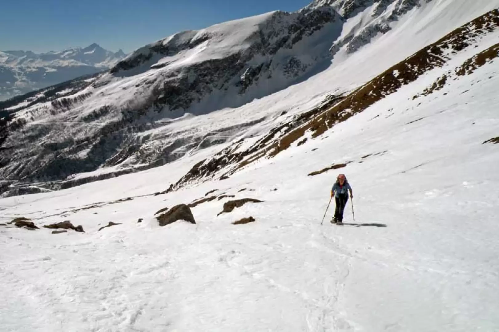 The bivouac is a beautiful wooden building located on a small clearing at the Col de Bouegno Bas on the long ridge that descends to the orographic left of Col Valsorey; the view is a little closed towards the north but is exceptional in every other direction with unusual perspectives towards the nearby Mont Velan, Grand Combin and Mont Gelé and sweeping over the countless peaks of the southern part of the Valle d'Aosta. This hike, exposed all the way to the south, should be tackled in the slightly late season with well-seasoned snow conditions and the slopes beyond Tsa de Porchère and the final gully already unloaded. The ascent, which is very open and scenic, is not very popular and therefore it is necessary to take into account that the absence of the track increases the effort even if the route itself is quite clear.