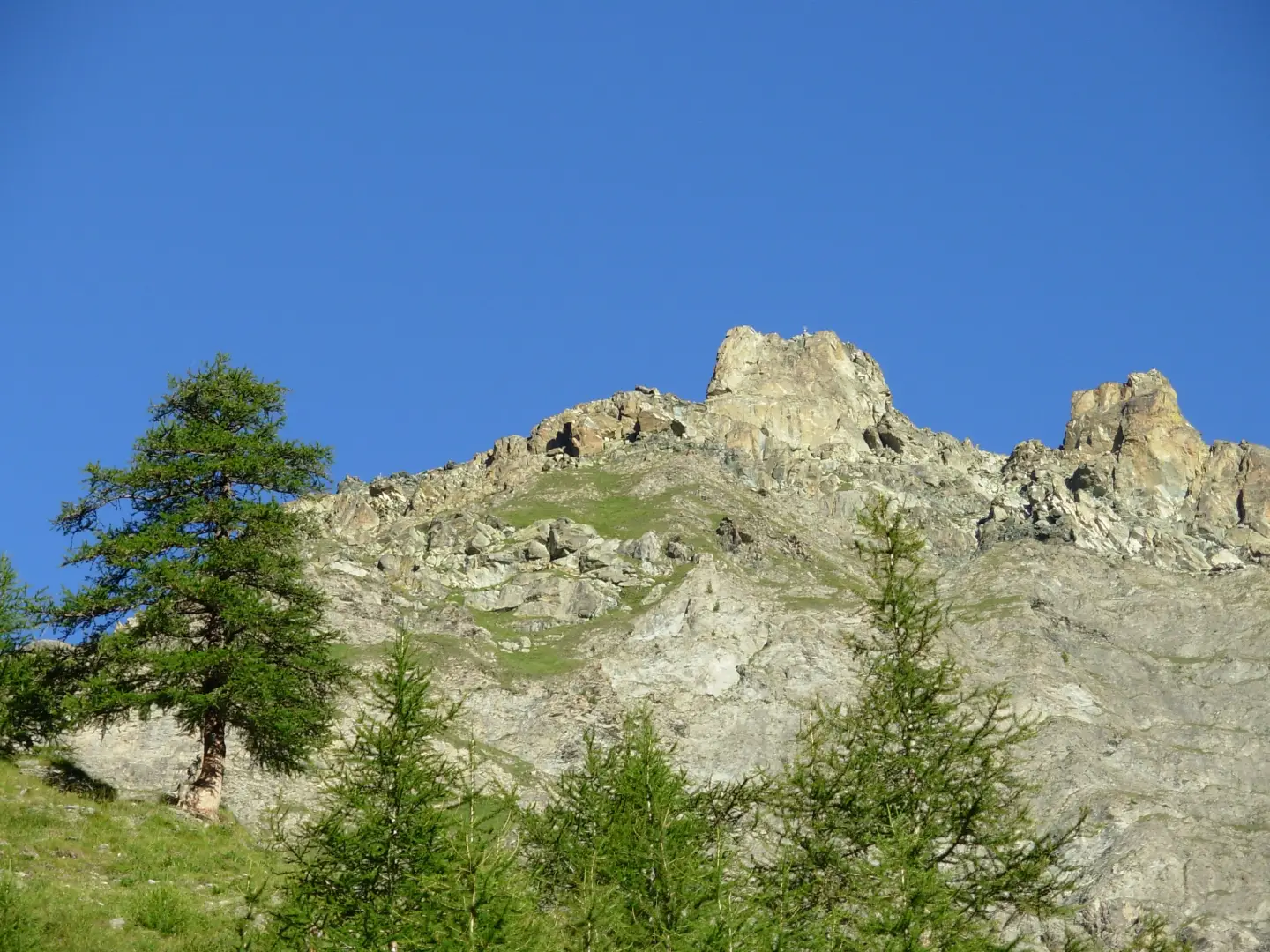 Lasciato il parcheggio ci si avvia lungo la sterrata che si lascia dopo poche centinaia di metri per svoltare a sinistra lungo il percorso della . Il sentiero entra nel bel bosco di larici e si innalza prima a diagonale poi per svolte fino a raggiungere il Cumbal dell’Asino e la Grange Torrette (2222m).