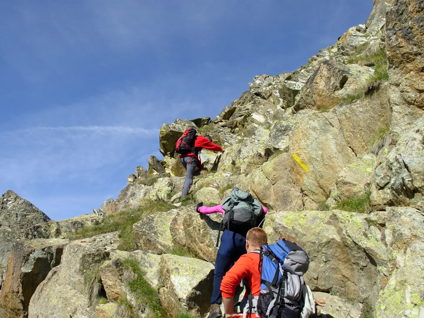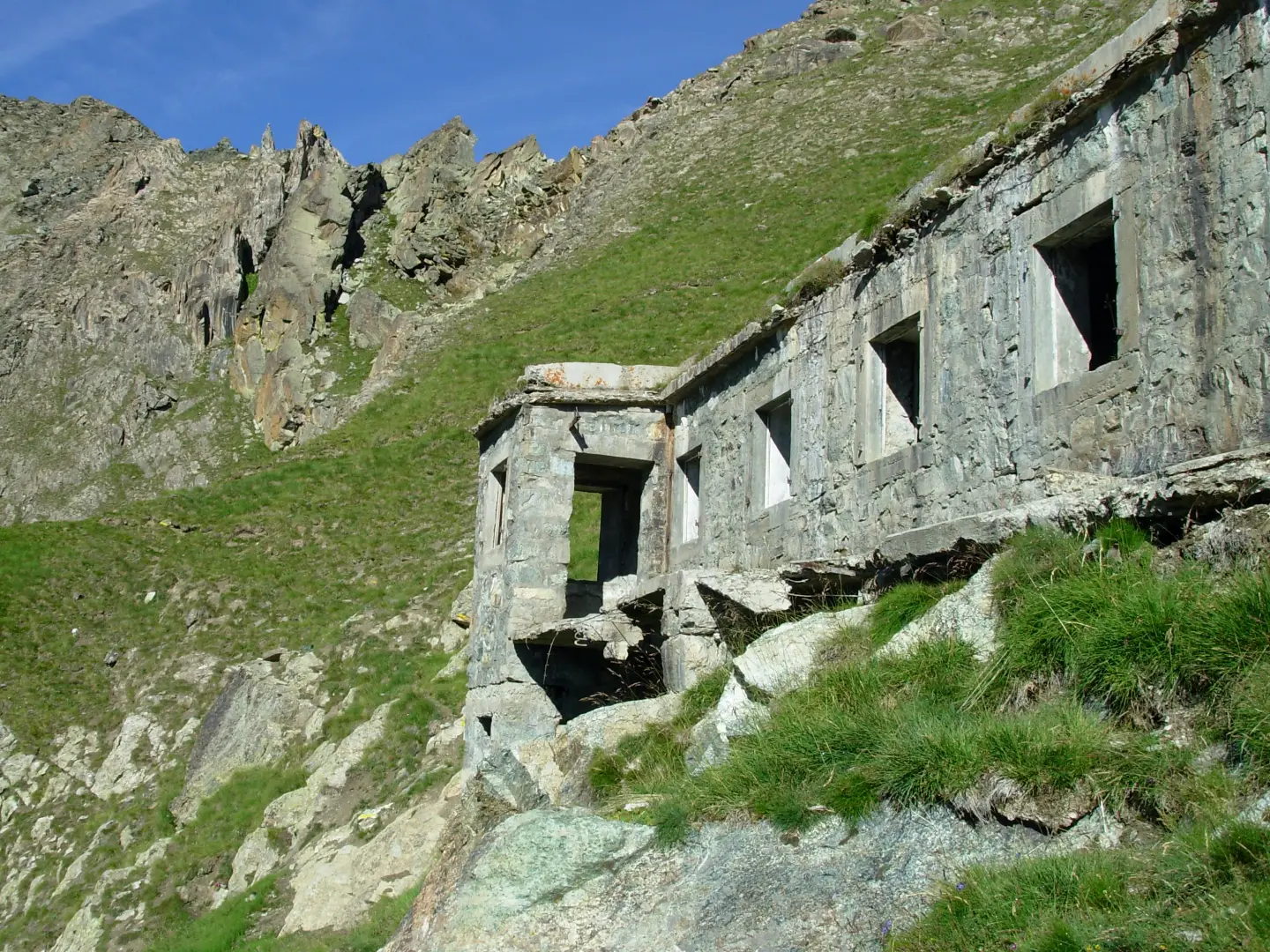Il sentiero piega a destra e sale fino ad incontrare una casermetta. Ora il sentiero diventa una traccia che parte a sinistra della casermetta e con numerose svolte dapprima su terreno franato, poi su pendio erboso e infine su roccette a volte un po’ instabili raggiunge il colletto a quota 2841. Superba vista sul Lago Nero e sul Lago Blu.