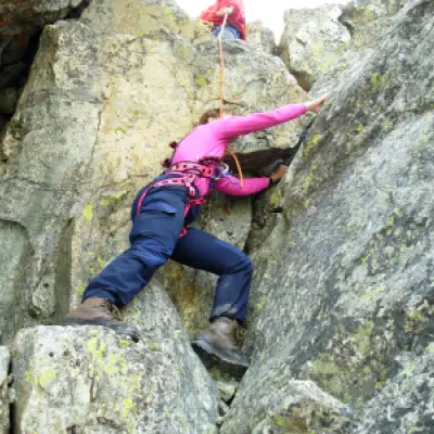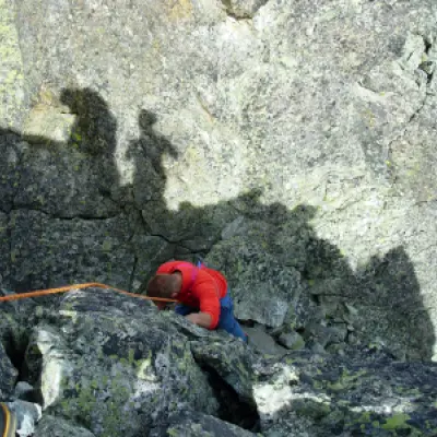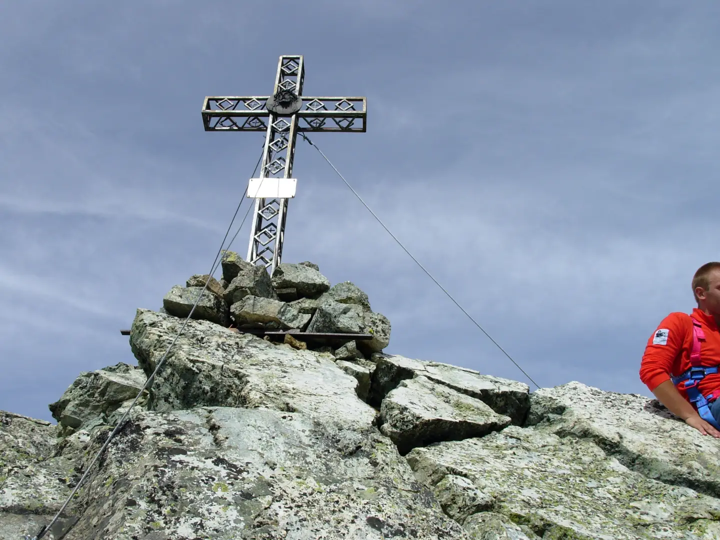 Calzata l’imbragatura si volge a destra per arrivare, su rocce, all’attacco della parete O. Si affronta prima un diedro, poi si piega a destra per placche inclinate che portano ad un altro diedro (passaggio di III). Dopo una divertente arrampicata su roccia compatta si affronta un tratto aereo per passare al dente sul quale si trova la croce di vetta.
