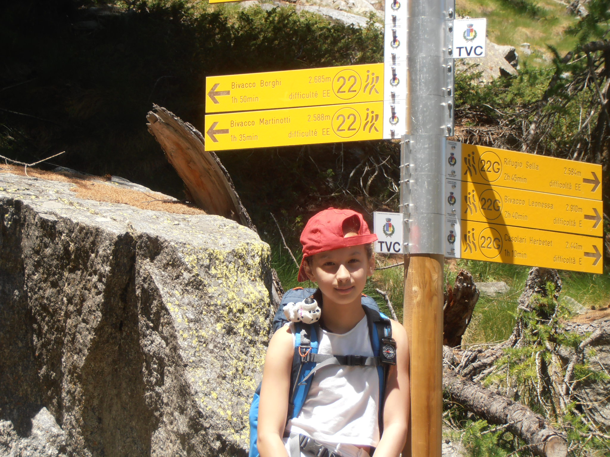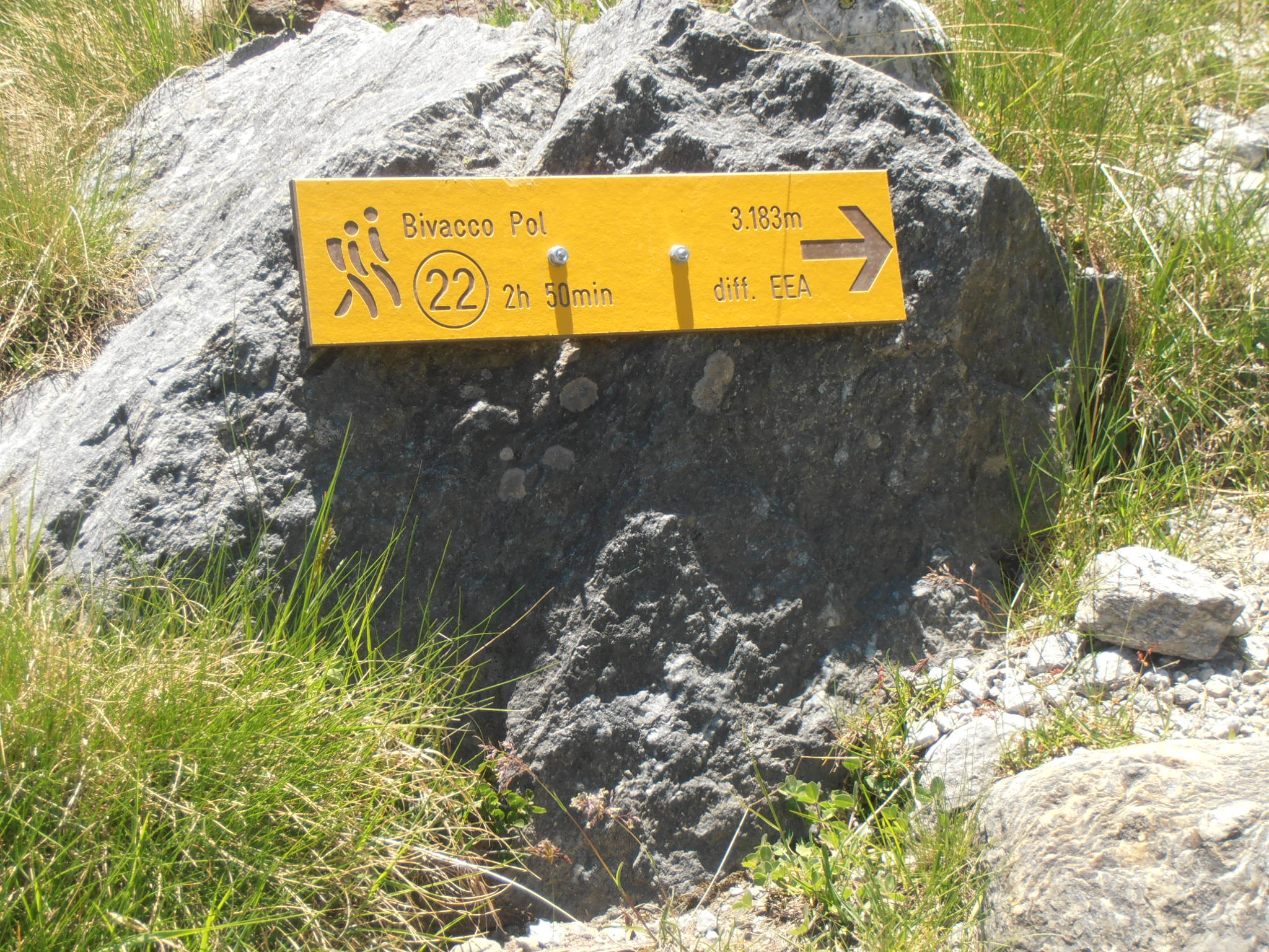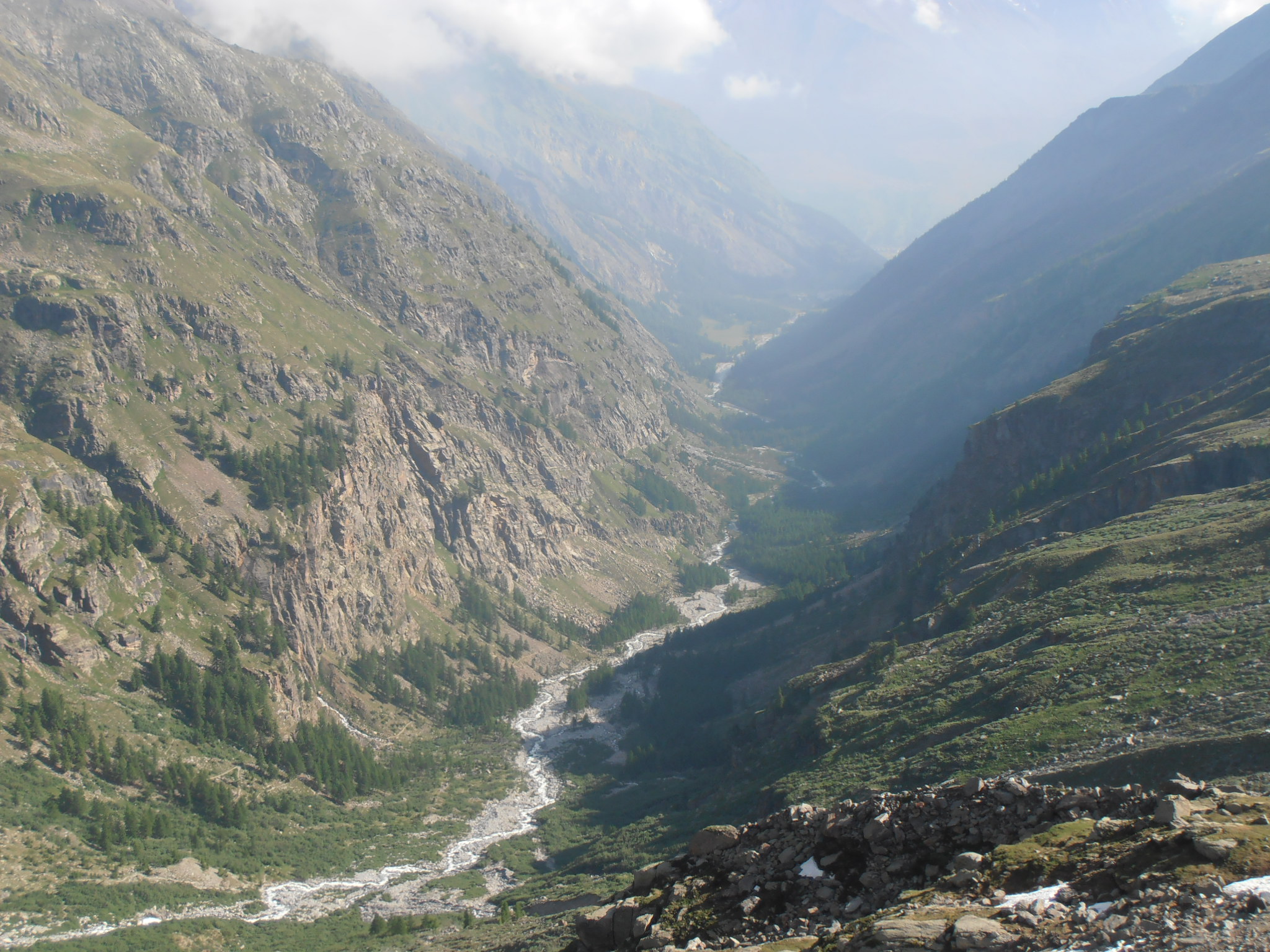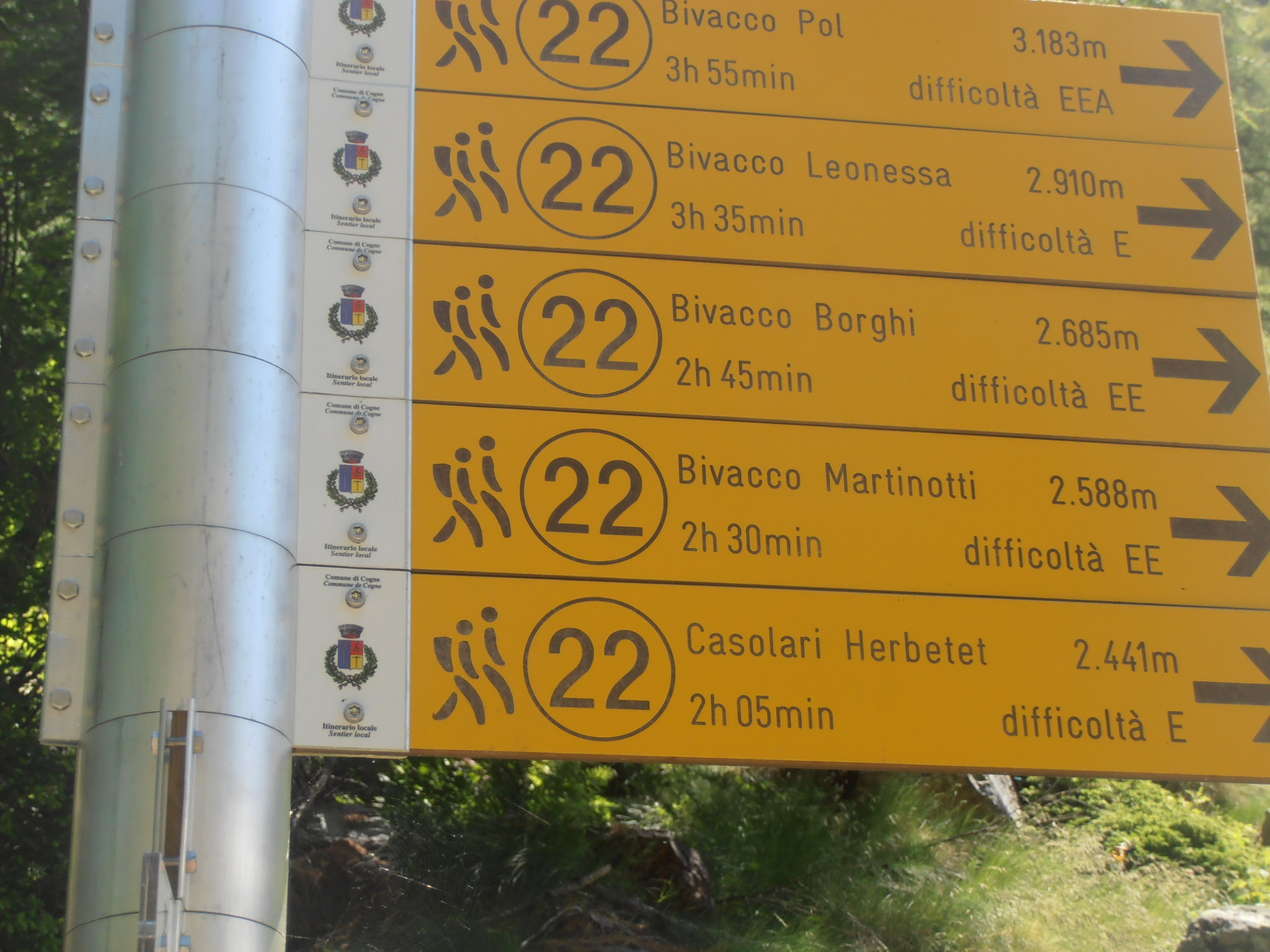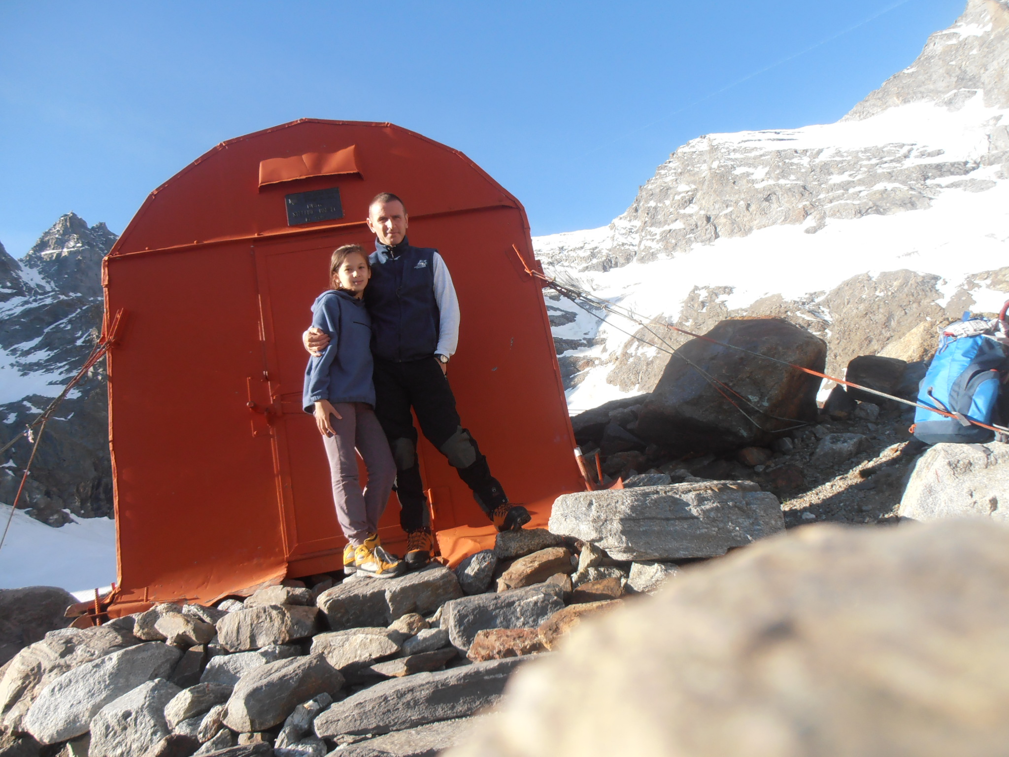 Dal parcheggio ci si dirige verso il ponte sul torrente che si lascia a destra e si prosegue in direzione del vallone sulla strada che diventa subito sterrata e dove si trovano le paline di partenza dell’itinerario. Si cammina in piano passando davanti al campeggio e ci si inoltra nel bosco percorrendo la vecchia strada reale di caccia oltrepassando il bivio di un sentiero che si stacca sulla sinistra; durante la progressione lungo il vallone si ha sempre davanti lo spettacolo dei ghiacciai della sua testata e delle alte vetta che gli fanno da corona. Si oltrepassa quasi subito la baita di David (1713 m) e proseguendo oltre si attraversano le baite di Vermiana (1745 m) arrivando dopo circa un quarto d’ora ad abbandonare la sterrata per imboccare il sentiero ben segnalato che si diparte sulla sinistra (1784 m). Camminando sempre quasi in piano si oltrepassa ancora un bivio da dove sulla sinistra inizia il sentiero per il Money (1810 m) e, superato un torrente, si arriva al ponte des Erfaulets di recente costruzione (il vecchio è crollato per le abbondanti nevicate invernali) che oltrepassa il torrente Valnontey e si prosegue sulla sponda opposta costeggiando il corso d’acqua a fianco di un’alta bastionata rocciosa superando una frana di grossi massi. Dopo essere passati su di una robusta passerella di legno si arriva al bivio (2047 m) dove sulla destra si abbandona il sentiero che sale ai casolari dell’Herbetet ed il sentiero continua in leggera pendenza tra la bassa vegetazione arrivando ad un ennesimo bivio (2101 m) dove si lascia a destra la traccia che conduce al bivacco Pol; subito dopo si oltrepassano ancora una volta le impetuose acque del torrente Valnontey su di un solido ponte e, ad una quota di 2158 m, si lascia a sinistra il sentiero per il Money. Ora il tracciato, iniziando ad avere una pendenza più accentuata, si alza tra bassi cespugli arrivando ad un canale di rocce che si supera direttamente arrivando al bivio per il bivacco Martinotti (2226 m) dove si prende il sentiero a destra che inizia a risalire una morena erbosa la cui pendenza aumenta sensibilmente a mano a mano che si procede. Arrivati ad una grossa roccia la si contorna in piano sulla sinistra per riprendere subito la morena, ora più ripida, che piega leggermente sulla sinistra divenendo di terra e sassi; rimontandola molto faticosamente si arriva ad un punto (2571 m) dove la traccia scende a destra verso una pietraia situata in una larga conca ai piedi del ghiacciaio di Gran Crou e da dove si può vedere la rossa sagoma del bivacco sopra un isolotto roccioso. Persi alcuni metri di dislivello si prosegue, ben guidati dai bolli di vernice, attraversando la pietraia e dirigendosi verso il promontorio lo si rimonta su rocce ripide si arriva in breve alla sommità dove è situato il bivacco.
