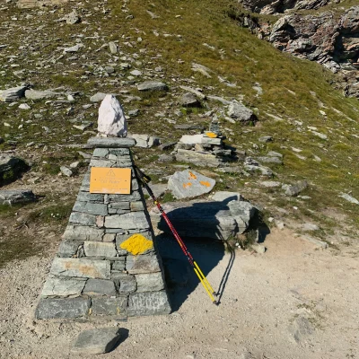 1h25' 2,16km Questo si sposta verso sinistra e, con ampie svolte nel lariceto, raggiunge la dorsale soprastante. Scavalcare la dorsale, portandosi prima sul fianco, poi su una balza rocciosa protetta da staccionate. Raggiungere un ripiano da cui si riprende a salire con tornanti fino al bivio per l’Alpe Obermontel (2.220m). Proseguire la risalita verso il centro del vallone, lasciando a destra un alpeggio molto primitivo, fino a raggiungere le costruzioni dell’Alpe Loaôche, dotata di fontana (💧). Superare un paio di torrentelli e un altro alpeggio situato nei pressi dell’impluvio del Torrente di Montil (Mòntélbach), che solca il centro dell’ampio vallone. Risalire quindi il pendio fino a un terrazzo panoramico, dove si trovano i ruderi degli alpeggi di Pinter (💧) (2.465m). Proseguire tra spazi aperti, rimontando una balza nel vallone, che progressivamente si restringe. Attraversare un falsopiano e poggiare a destra, per incrociare il canalone detritico sotto le pendici del Mont Pinter, e affrontare la rampa finale tenendosi a destra, nel punto di massima depressione fino a raggiungere il Col Pinter (2.777m), una marcata insellatura tra due vette molto panoramiche e rappresentative, il Corno Vitello a sud e la Testa Grigia a nord 3h30' 5,75km .