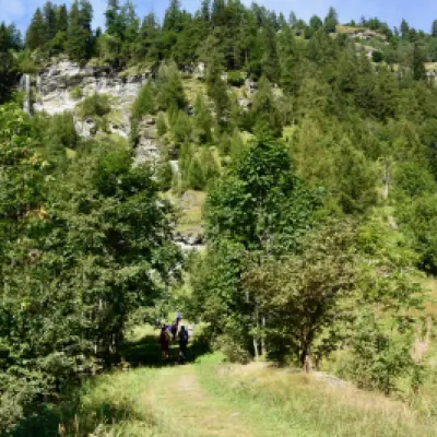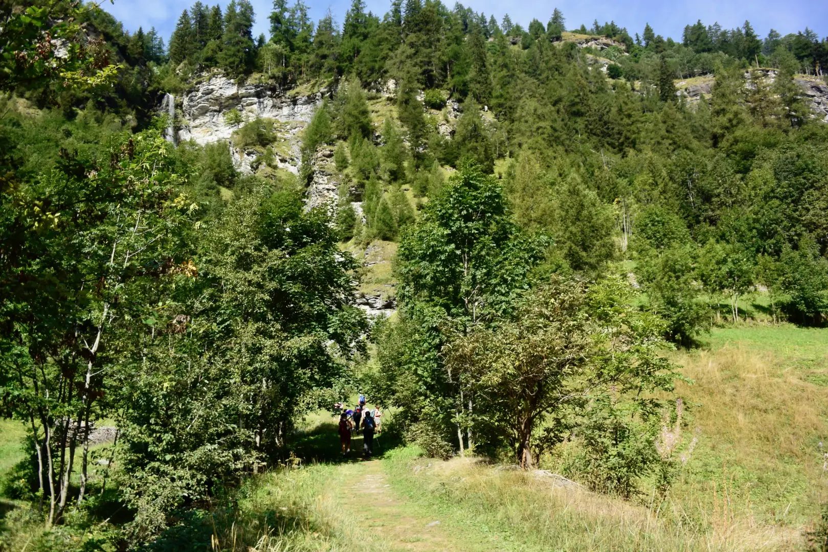 0h00' 0,00km Procedere sulla stradina asfaltata che sovrasta il parcheggio e raggiungere la palina segnaletica che indica l’inizio dell’itinerario. Svoltare a destra in direzione della cascata visibile di fronte; dopo un breve tratto pianeggiante, girare nuovamente a destra per imboccare l’ampia mulattiera dell’Alta Via 1. Risalire il ripido pendio attraverso una serie di tornanti che fanno guadagnare rapidamente quota, entrando in un bosco dominato da larici (Larix decidua), con presenze sporadiche di aceri (Acer pseudoplatanus). Dopo un lungo traverso verso destra, riprendere a salire con brevi svolte, fino a raggiungere alcune panche panoramiche a quota 1.526m. Superare le panche e svoltare a sinistra lungo un tratto protetto da ringhiera: qui il bosco si dirada, offrendo un’ampia vista sulla conca di Gressoney-Saint-Jean. Proseguire fino a raggiungere uno stadel ben conservato e, poco oltre, un piccolo oratorio, situato nei pressi di un bivio (1.592m).