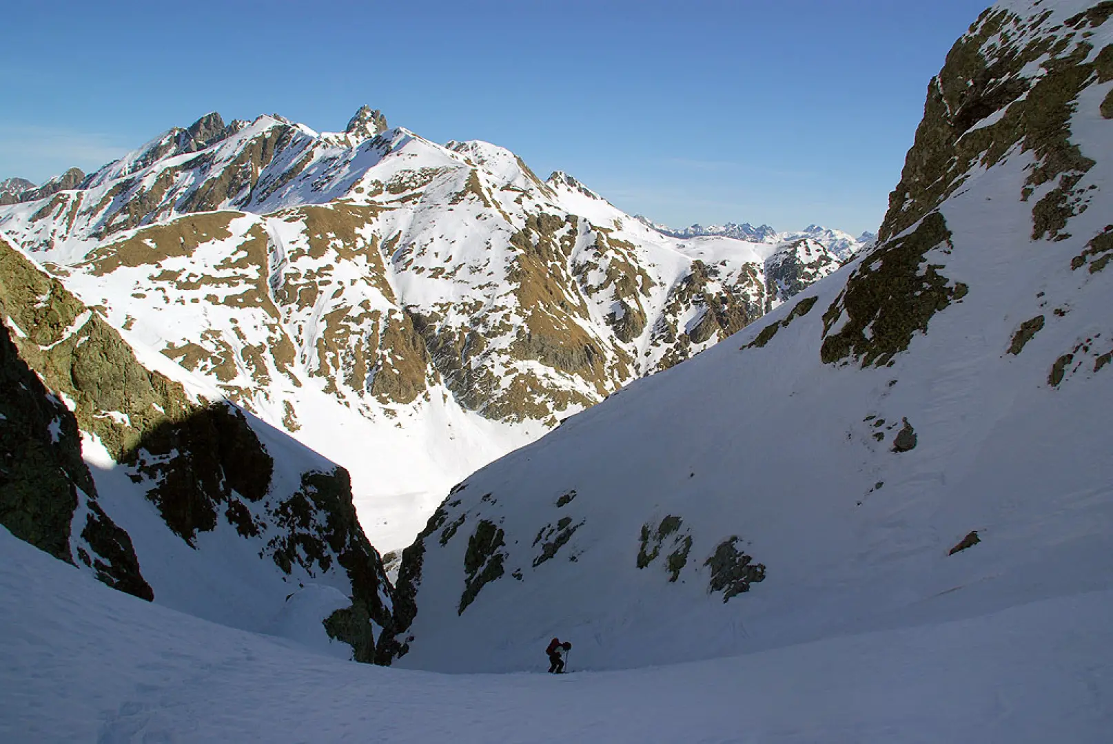 Dai parcheggi della stazione sciistica di Pescegallo (comune di Gerola Alta - SO) si imbocca la strada di servizio delle piste che a lunghi traversi e tornanti si porta in quota alla piana di Salmurano 1848m (presenza di ristoro). Da qui si segue sulla destra la linea di salita dell'unico skilift, fino alla stazione di arrivo superiore. A questo punto si lascia la civiltà e si imbocca verso destra un traverso poco pendente unable to parsehe conduce all'evidente intaglio del Passo Salmurano Occidentale 2017m (paline di segnalazione in loco). Qui bisogna togliere le pelli e scendere di 150m di quota - con bella sciata esposta a sud - fino all'ampia conca sottostante - Baita del Piano 1855m. Rimesse le pelli e accertatisi della tenuta dei pendii, ci si avvia a risalire l'evidente canalone in direzione ovest per tutta la sua lunghezza, con un tratto intermedio più riposante, fino al suo sbocco nei pressi della Bocchetta di Valpianella 2224m. Questo canalone - tratto chiave della salita - si trova per intero al di là del displuvio e quindi in provincia di Bergamo - Alta Val Brembana, è molto incassato e gelato, spesso le pelli sono al limite della tenuta e potrebbero venire utili i rampanti; BSA. Sbucati nei pressi della Bocchetta di Valpianella (esposizione sud) è necessario risalire con estrema attenzione e delicatezza il pendio che ci si ritrova sulla destra e che conduce in breve alla Cima dei Piazzotti Occidentale 2340m o Cima di Valpianella. Se il citato ultimo pendio risultasse di tenuta sospetta, conviene togliere gli sci e risalire il filo della cresta sud-est per la linea di massima pendenza fino in vetta, facendo attenzione alle eventuali cornici. Il panorama, visto l'isolamento su tre versanti della vetta, risulta amplissimo. La discesa può anche essere effettuata lungo il percorso di andata, ma con il grave difetto di dover risalire al Passo Salmurano. Il percorso più interessante, che se fattibile può anche arrivare ad una classificazione OSA, conduce inizialmente con divertenti scivolate su ampi pendii molto facili fino al visibile Rifugio Benigni 2222m, posto a fianco del ghiacciato e innevato Lago dei Piazzotti. A poche decine di metri dal rifugio si va ad imboccare con cautela il canale percorso dall'emissario del lago (inizio della discesa di Val Tronella); da qui l'esposizione è un nord con condizioni sempre ideali. I primi quaranta metri di dislivello sono il clou della discesa: pendenza fino a 40 gradi in un canale largo 3-4 metri, dove la neve anche se ben assestata spesso non fa buona presa sul ghiaccio di cascata sottostante; non sempre il canale è percorribile, o è percorribile con ramponi e piccozza. Superato questo tratto, il pendio, pur sempre sostenuto, si allarga e concede serpentine in neve vergine anche dopo ripetuti passaggi. Si prosegue lungo la Val Tronella incontrando i primi larici nei passaggi divertenti fra grandi massi innevati; si transita nei pressi de La Sorgente 1808m (piccola presa d'acqua per le Centrali elettriche della zona). Da qui si procede nel rado bosco fino alle Baite del Dossetto, punto di transito obbligato per rintracciare il sentiero - da imboccare verso destra - che attraverso un bosco breve ma molto tecnico conduce su aperti pendii in vista dei parcheggi della località di partenza.
