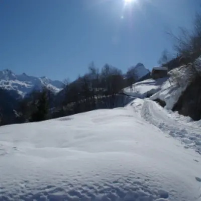 Abbandonata l'auto a circa 1200m di quota, conviene proseguire sulla strada innevata (tracce di motoslitte) fino ad uscire sui ripidi prati sotto la contrada Castello: con ripide serpentine si raggiungono le baite 1307m e si prosegue su uno stradello fra le case per guadagnare un'altra fascia di prati. Si risalgono anche questi sbucando su terreno aperto nei pressi della chiesetta di San Rocco 1395m; poi si raggiunge a vista la contrada Laveggiolo 1471m. Si prosegue sui prati fino al margine del fitto bosco di abeti: se ne contorna il limite verso sinistra entrando brevemente in Val Vedrano (mantenendosi presso gli alberi si evita il rischio di staccare valanghe - peraltro anche spontanee - sul versante sottostante sulla verticale di un altro frequentato itinerario). Appena possibile, con un tornante, si sale ad entrare nell'abetaia - ora meno fitta - e ci si porta, scegliendo bene il percorso fra le piante, sul costone nordest della montagna; il bosco è sempre meno fitto, e i larici si sostituiscono agli abeti. Su terreno aperto e sempre più panoramico si segue la comoda cresta fino ad un'ultima impennata per l'anticima 2245; da qui il terreno si mantiene sciabile fino alla vetta del Monte Colombana 2385 m, ma si tratta di un lungo traverso in falsopiano da percorrere alla dovuta distanza dal crinale per le abbondanti cornici e facendo attenzione alle lastre ghiacciate su terreno abbastanza esposto. Discesa per il percorso dell'andata.