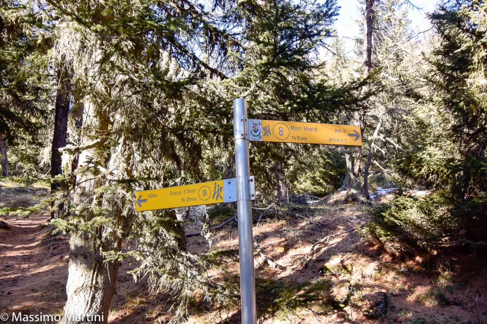 Dal centro di Torgnon, seguire l'indicazione a sinistra per il Col St Pantaleon. Parcheggiare a Ronc (Les Roncs). Attraversare la strada e sulla curva sale il sentiero nr 3. Arrivati alla sterrata si volta a sinistra e si continua fino a ritrovare l'indicazione che ci fa salire per il bosco. ATTENZIONE il primo tratto di sentiero e' crollato e bisogna quindi farsi largo tra alberi ed arbusti sino a ritrovare la traccia che prota al Col des Bornes 1781. Per evitare questo pezzo si puo' stare sulla strada a destra che, con cammino piu' lungo, riporta alla strada proveniente dal Col des Bornes. In questo caso si gira a sinistra e si scende fino al colle dove una pallina sengaletica indica il sentiero nr 1 per la Becca d'Aver. E' un sentiero che sale dritto nel bosco con pendenza ma senza tornanti se non nell'ultimo tratto. Proseguendo sul nr 1 si arriva al Col d'Aver (2330m) dove, anziche' i soliti nastri per tenere fuori (o dentro) il bestiame, e' stato usato del filo di ferro! Si volta a sinistra e si continua a salire passando di fianco a una cappella e una croce. Da li la vetta e' a qualche minuto di cammino (2469m). Per raggiungere l'anticima del monte Meabe' ci sono due possibilita': proseguire per il sentiero nr 9 che in cresta e a tratti attrezzato, porta a La Fenetre per poi scendere e ricollegarsi col nr 8 oppure, come abbiamo fatto noi, tornare al colle e prendere il sentiero numero 11 (facendo attenzione al filo spinato sopra citato!!). Il sentiero 11 termina su piste da sci. Arrivati in fondo si gira a sinistra, si passa davanti ad una fattoria e, all'altezza di altri campi da sci, si risale per i incontrare il sentiero nr 8 nel bosco. Si passa per una bella area tranquilla, ideale per pic nic e per rilassarsi, e si continua a salire fino ad incontrare il sentiero nr 9 dove si volta a destra. ATTENZIONE, sono stati corstruiti dei nuovi paravalanghe proprio sul sentiero, quindi per arrivare alla vetta si deve passare tra i pannelli facendo attenzione a non inciampare sui cavi metallici. La discesa segue il sentiero dell'andata. In alternativa si puo', arrivati a Fonten, proseguire sulla poderale fino a Col des Bornes (o prima di arrivare al colle si puo' prendere la strada sulla sinistra per evitare il tratto di bosco dove il sentiero e' crollato) e riprendere la via della discesaAntecima Mont Méabé
