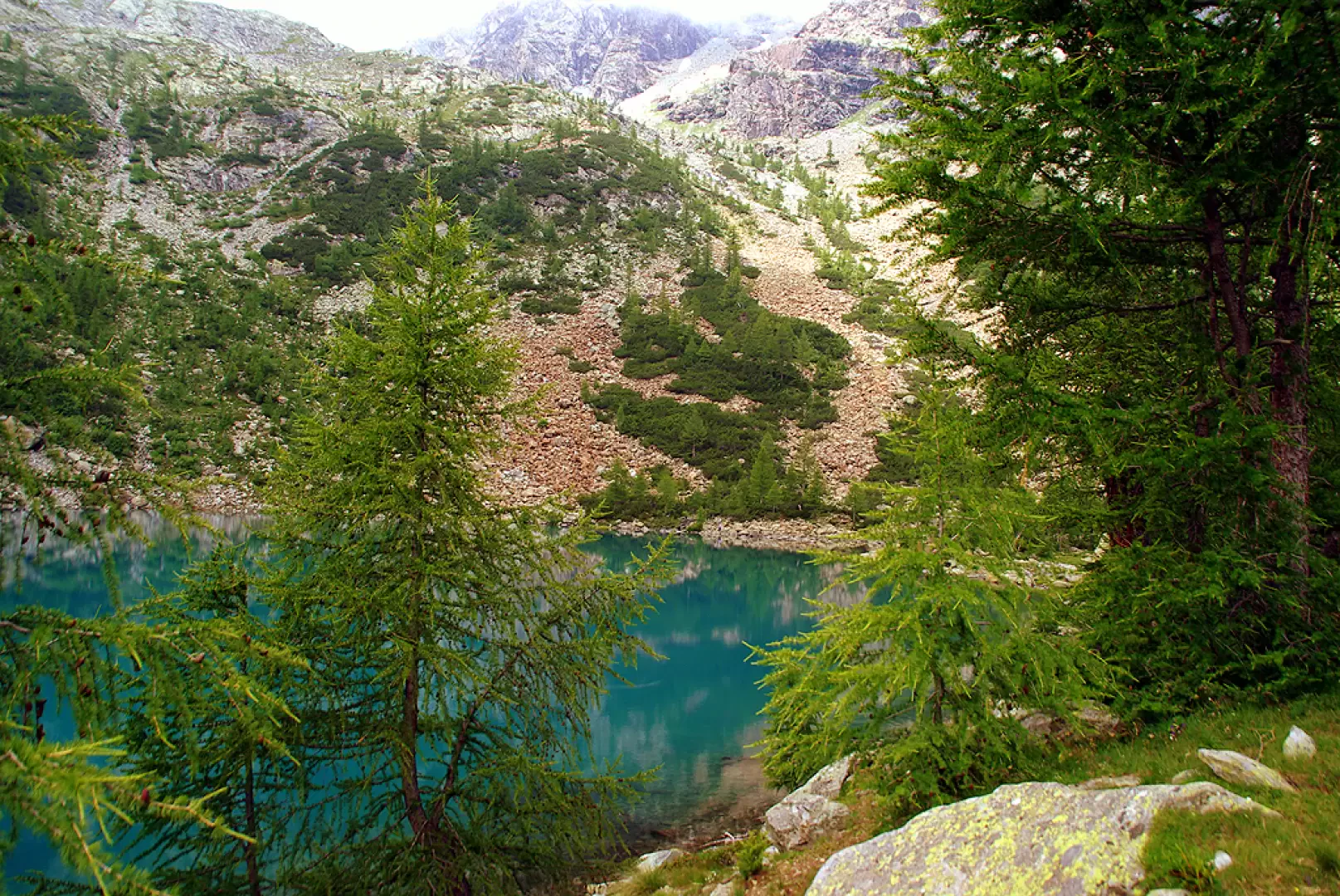 From the car park, in just a few steps, we descend via a steep little path to cross the Mallero stream on a bridge; on the other bank the path, always well signposted but constantly steep, climbs in hairpin bends through the dense fir forest. After about an hour, the vegetation thins out and the larches replace all the other trees: you cross, still climbing, the clearings - now covered with rhododendrons and blueberries - of the Alpe Lagazzuolo (1974m): the old huts in disuse (but intact) have been replaced by the modern * chalet "Bivacco degli Alpini". Continue on and, passing the edge of the valley, you will reach Lake Lagazzuolo 1992m ("Lagusc" in dialect); the track continues flat to the right and, after crossing the small outlet, begins to climb among the red boulders of serpentine a pasture rib beaten by avalanches and covered with debris. The steep ascent leads to flanking the basal rocks of the wall above, where the path - up and down - changes direction to enter the valley leading to the pass. Past a small nameless pond, frozen until late in the season, the trail disappears; but following it, the precise signposting in paint leads us to choose the least tiring passages over the very steep and unstable terrain; in the last stretch, we ascend wide residual snowfields. When you reach Bocchel del Cane (2551m), the panorama is sweeping towards the highest peaks of the Disgrazia group, but your gaze is attracted by the turquoise water of Lake Pirola (2284m), at the foot of the descent gully, immersed in an expanse of orange-brown boulders. The signs lead quickly downhill to a pastureland shelf - unique in this area - and then back to a labyrinth of unstable boulders not far from the shores of the lake, which is not reached. The path, which is more visible, leaves the track to the right for Torrione Porro (a climbing gym) and descends steeply with loose boulders and steps to reach the first plants; but before reaching the woods in view of the Porro hut, it crosses another area of boulder-strewn landslide. Amidst the centuries-old pine trees, we reach an incredible * path of recent landslides that descends in hairpin bends across the steep slope to the Val Ventina esplanade 1960m (Rifugio Gerli-Porro and Ventina huts). From the hut, descend to Chiareggio 1612m along the forest service track in about 40 minutes. When you reach the bridge over the Mallero torrent, do not cross it and, at the fork, choose the path to the left; the beautiful track climbs a rocky shoulder covered with a dense and damp fir forest for about 150m. You reach a sort of plateau with blueberry and rhododendron glades and traverse it, also flanking a couple of peat bog wetlands; then with a very steep descent through uneven woodland, you reach the abandoned hamlet of Senevedo Inferiore 1485m. The path, now level with the stream bed, runs alongside it for a few hundred metres until it crosses over a double bridge; on the other bank, after a very short climb, we reach Carot 1462m. From here, unfortunately, there is nothing left to do but follow the provincial road for about a couple of kilometres to the car park.