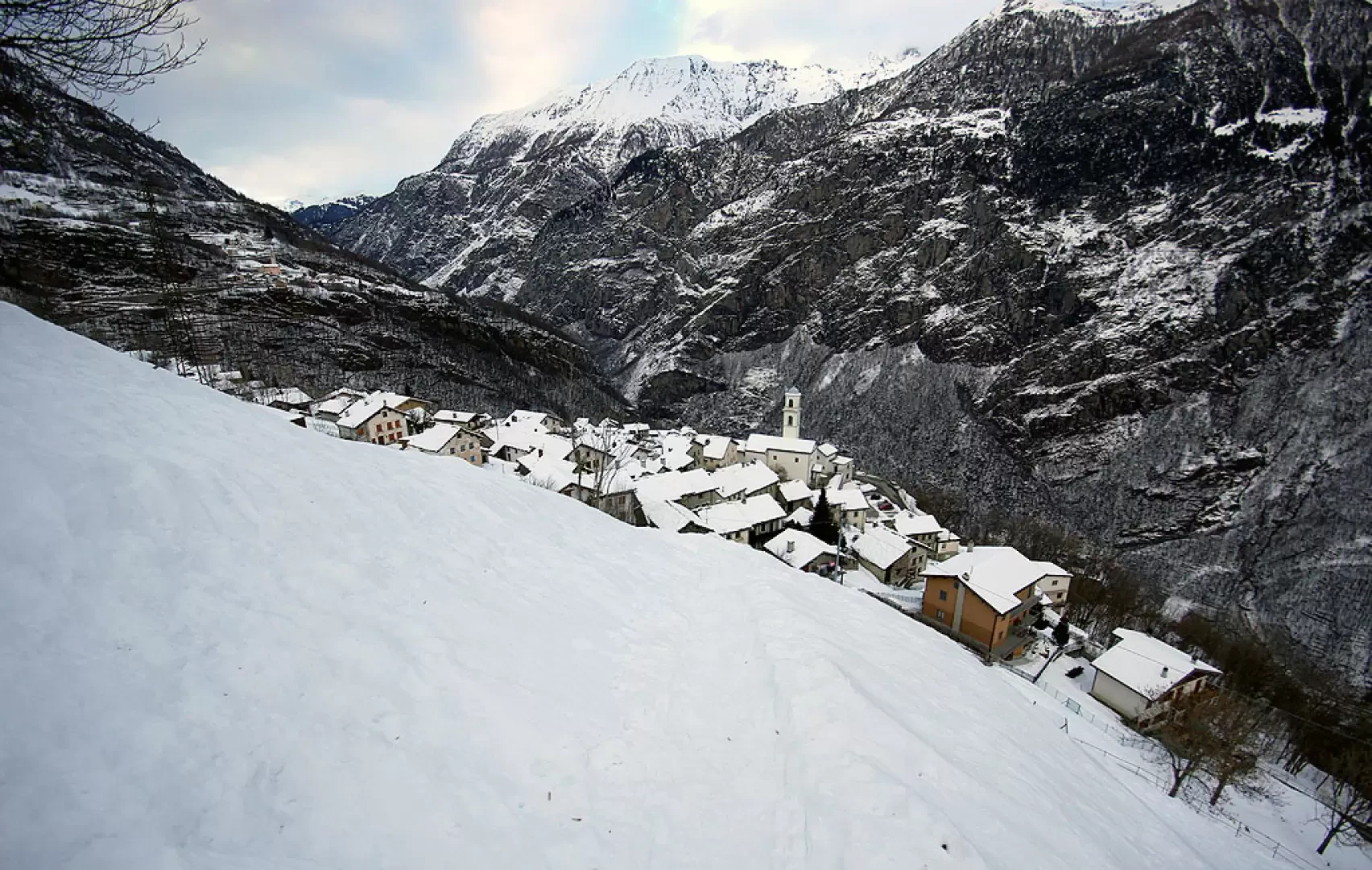 We cross the group of huts heading south and, on the descent, wade across a small stream on snow bridges; on the other side we begin a steep ascent - for short, apparently unstable stretches - that with narrow hairpin bends alternating with traverses heading eastwards leads to a series of small valleys at the edge of the last larch trees. The slope drops and, with a long flat shift, we cross the plateau where the invisible Lago Grande 1889m is located. Suddenly the slope changes and we take a very steep gully of powdery snow that, having re-entered the sparse woodland, leads behind the Laguzzola hump 1768m; past the huts, we flank a small modern chapel and begin a long descending traverse to the east that leads - past a spruce reforestation - to the end of the trees: from here we must descend as best we can across the meadows towards Olmo. The accentuated slope and the often crusty snow make the last few steps tiring; you return to the village at the post met at the start.