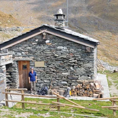 On dépasse l'alpage en le contournant par la droite et en empruntant un sentier qui devient plus évident à proximité d'un gros rocher où se trouvent des marques (20) (20b). On commence maintenant à monter la partie la plus difficile de l'excursion, le sentier avec de grands virages monte la marche qui nous sépare de la vallée de la Molline. Nous passons une courte bande de mélèzes et continuons en visant entre deux grands rochers ; le chemin est toujours dégagé et accompagné de buissons de myrtilles et de genévriers. Le dernier tronçon du sentier pour franchir la marche est légèrement plus raide et rejoint finalement le sentier en provenance de Tsa de Menovy (2253m, 2h00'). Du carrefour, continuer tout droit en direction de la vallée de la Molline et rencontrer immédiatement les ruines des chalets de la Molline Vieille (2295m, 2h05'). Le sentier tourne légèrement à droite jusqu'à atteindre la base d'une crête morainique couverte de pelouses alpines ; suivre la crête morainique le long de sa ligne de crête, en pénétrant discrètement dans ce milieu sauvage et suggestif. Après un tronçon de montée, le sentier descend brièvement, puis remonte et rejoint enfin le bivouac de la Molline (2415m 2h30'), visible pratiquement au dernier moment. Peu avant le bivouac, une croix de pierre se dresse devant l'imposante masse du Mont Velan.