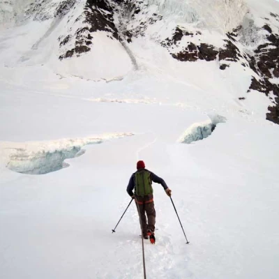 Con questa lunga e faticosa ascensione si raggiunge la più alta vetta situata interamente in territorio Svizzero per suo grandioso versante ghiacciato settentrionale. Non essendoci impianti di risalita bisogna necessariamente partire dal fondovalle ed ogni metro di dislivello si può ben definire sudato sia per le pendenze sempre sostenute sia per lo sviluppo dell’intero itinerario di 23 km circa. Pur essendo, come detto, lunga e faticosa questa salita è abbastanza frequentata con la traccia sulla parte alta del ghiacciaio quasi sempre presente e comunque con itinerario logico ed intuitivo mentre, nella prima parte oltre le grandi morene sopra il rifugio, bisogna affrontare di notte la prima parte di esso che si presenta con molti crepacci ed il cui attraversamento può comportare alcuni zigzag ed attraversamenti su ponti nevosi e dove, in generale, in ogni caso bisogna prestare molta attenzione. Sulle rocce, mobili e su terreno instabile, che si devono risalire per raggiungere il Festijoch si trovano alcune soste su spit che in salita facilitano gli eventuali ancoraggi mentre per la discesa, disponendo di due corde da 50m, si può effettuare un’unica calata in doppia che evita di ripercorrere in discesa questo tratto infido. Dalla vetta il panorama è semplicemente stellare e comprende un giro d’orizzonte eccezionale sulla catena alpina con decine di 4000 che la circondano con bellissime viste ravvicinate su quelli delle vicine valli di Zermatt e Saas Fee; il rifugio Domhütte si trova anch’esso in posizione molto panoramica e si raggiunge da Randa con un lungo e ripido sentiero, in parte attrezzato. Per l’itinerario completo bisogna calcolare almeno 11 ore di salita di cui circa 6 per la parte dal rifugio alla cima mentre per il ritorno si deve mettere in conto che, dopo i 1600 m di dislivello del mattino, bisogna affrontare gli oltre 3100 della discesa.