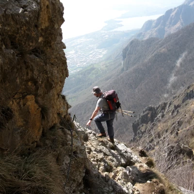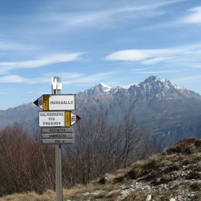 Lasciata l’auto proseguire per la strada che, da asfaltata diventa presto acciottolata. Poco più avanti, presso una piccola cappella e una palina con le indicazioni dei diversi percorsi, si abbandona la mulattiera e si volge a destra su sentiero segnalato con i numeri 6 e 7. Si sale ora nel bosco in direzione Nord Nord-Ovest con pendenza costante e moderata fino a raggiungere, a quota 716, un bivio presso la Fonte di Sambrosera. Alla palina con cartelli segnalatori seguire a destra il sentiero numero 6 che volge a Nord-Est e, con pendenza sempre più ripida, porta a un canalone che si risale faticosamente per raggiungere la bocchetta di Sambrosera, quotata 1192 m. Da qui lo sguardo spazia sul versante Nord con vista su tutto il lago di Como e sulle cime circostanti: dalle Grigne alle più lontane Alpi svizzere. Si punta ora a Est su un sentiero detritico per il quale si raggiunge in poco tempo la croce posta poco sotto la vetta del monte Moregallo (1276 m), cima erbosa presso un boschetto di faggi. Dalla vetta si delinea il profilo a festoni della cresta Ovest, oltre la quale si riconosce il Corno Orientale di Canzo e più oltre il rifugio SEV Pianezzo, posto sotto il Corno Centrale di Canzo. Il sentiero corre tra l’erba per qualche decina di metri, ma precipita subito verso Sud in uno stretto canalone che si percorre con l’aiuto di catene e che scende per circa cinquanta metri prima di trovare una biforcazione. Prendere a destra la traccia che sale tra erba e rocce e, ancora con l’aiuto di catene, percorrere il filo di cresta che, con percorso vario in saliscendi più o meno esposti, scende alla Bocchetta di Moregge quotata 1110 m. Cartelli segnalatori indicano a destra la via per il rifugio SEV Pianezzo e a sinistra le diverse vie di discesa. Seguire il sentiero numero 7 che entra nel bosco con percorso a pendenza moderata e che conduce alla Fonte di Sambrosera, chiusura dell’anello. Il sentiero è ora lo stesso dell’andata e, in direzione Sud-Est scende al bivio presso la cappelletta posta sulla strada in pietra e cemento attraverso la quale, in pochi minuti, si rientra alla frazione Belvedere.