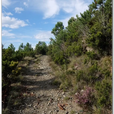 Quasi subito, dalla Colla di Pra (300m) sopra Acquasanta, si ignorano i segnali relativi al sentiero del Beato Frassati, continuando su una ampia pista. Si tralasciano delle diramazioni e la strada affronta una serie di tornanti. Perseverando nella salita, il tracciato si restringe. Con un semicerchio, superato il rio Condotti (asciutto), ecco che c'è la Cappelletta della Baiarda (chiusa) a 703 m. E' presto, pur tuttavia non dispiace una pausa. In lontananza spicca il bivacco Paganetto. Si riparte, fino ad un importante incrocio dove si taglia quasi in piano la montagna. Si sfiora una casupola, perdendo quota e immergendosi in una pineta. Un bivio (palina) costringe a una svolta di quasi 360 gradi a sinistra. Si rimonta brevemente fino ad intravedere una massicciata e, una volta raggiunta, si inverte di nuovo la marcia. Il bivacco Paganetto (710 m) è poco distante, nei pressi del monte Riondo. La piccola costruzione è proprio ben tenuta e un altra sosta è d'obbligo. Sulla sinistra, il Santuario della Madonna della Guardia attira l'occhio. In seguito, si sfiorano alcuni ruderi, perdendo quota fino al 'Cian de Figge' (625 m). Le vedute sulla costa sono molto belle! Si cala ancora lungo il costone della montagna verso Pra (due opzioni possibili), fino a incrociare il percorso delle “Lische Alte”. Ci si abbassa ancora, tenendo la destra per due volte (la seconda dalle “Lische Basse” per chiudere l'anello). La via è in falsopiano e segue le sinuosità del territorio. Guadati dei ruscelli, da un tornante ci si immette sul cammino del mattino. Scendendo, in breve, c'è la macchina che attende.