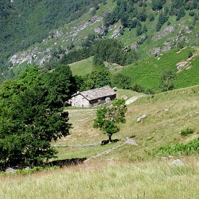 Lasciata l'auto (a quota 1150m circa), incamminarsi lungo la stradina asfaltata che con un ripido tornante ed un successivo traverso porta fuori dagli alberi e continua verso il Mucrone; il sentiero è segnato [D41] e sale da Pollone. Noi proseguiamo, abbandonando la strada dove è possibile e seguendo la traccia tra i pascoli. Salendo incontriamo parecchie cascine, tuttora abitate dai margari nel periodo estivo. Le più importanti, Alpetto inferiore (1250m), di mezzo (1400m), e superiore (1484m); nella zona dell'Alpetto inferiore una manica indica la direzione del vento per i deltaplanisti e per chi vola con il parapendio, che sale fin qui e si lancia per atterrare in basso, sui prati tra Occhieppo Superiore e Pollone; appena sopra, ad una deviazione del sentiero, un cippo ricorda un alpinista biellese, Paolo Bernascone, morto durante una ascensione in Nepal. Intorno bandierine nepalesi sventolano colorate. Dopo circa un'oretta siamo quasi all'Alpetto Superiore, la strada asfaltata finisce ed incomincia lo sterrato che aggira le pendici della Muanda verso Ovest; il sentiero è [D34], attraversa quasi in piano fino alle Alpi Muanda (1463m), per poi prendere quota con un paio di tornanti e continuare fino alle Sette Fontane, un grosso alpeggio le cui baite in pietra sono protette da poderosi paravalanghe (1537m, 1h30'). Sia salendo che dall'alpeggio, lo sguardo spazia sulle montagne circostanti, il Mucrone con la sua croce dietro di noi, e il Mombarone, il Pian dal Turo, i Bechit, di fronte. Ritorno per l'itinerario di salita; sotto di noi tutti i comuni della collina Biellese tra la Burcina ed il Santuario di Graglia, lontano, il lago di Viverone e la Serra, e ancora oltre, la piramide aguzza del Monviso.