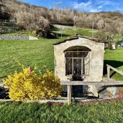 0h05' 0,21km 25m 0m 4 Trascurare il sentiero 1 per Grenella e svoltare a destra raggiungendo subito la località Barmet. Reperito un bollo giallo sull'asfalto svoltare a sinistra per addentrarsi nel piccolo abitato. Dopo una curva a destra, il sentiero inizia a risalire il crinale su un ampio selciato. Dopo pochi minuti si incontra il primo dei pannelli informativi che accompagneranno lungo tutto il percorso; accanto ai pannelli sono presenti comode panchine da cui godere del panorama. Proseguendo tra alcuni tornanti, si raggiunge una piccola grotta (barma). Il sentiero, affiancato da suggestivi muri in pietra a secco, conduce infine sulla stradina asfaltata per Clapey (560m), che verrà abbandonata all’altezza di un traliccio dell’alta tensione, svoltando a sinistra. Da qui si inizia a risalire dapprima una stradina, poi, svoltando a destra, un sentiero che attraversa i vitigni del Muscat de Chambave, fino a raggiungere un piccolo oratorio, antica testimonianza di devozione popolare. Proseguendo la salita, ci si addentra in una macchia boscosa di roverella (Quercus pubescens), fino a raggiungere una piccola cascata: si tratta delle acque di deflusso del Ru Chandianaz, prelevate nella valle del Cervino e utilizzate per irrigare i ripidi pendii di Chambave e Saint-Denis. Poco più avanti si incontra la partenza del sentiero 112 , che costeggia il ru appena citato.