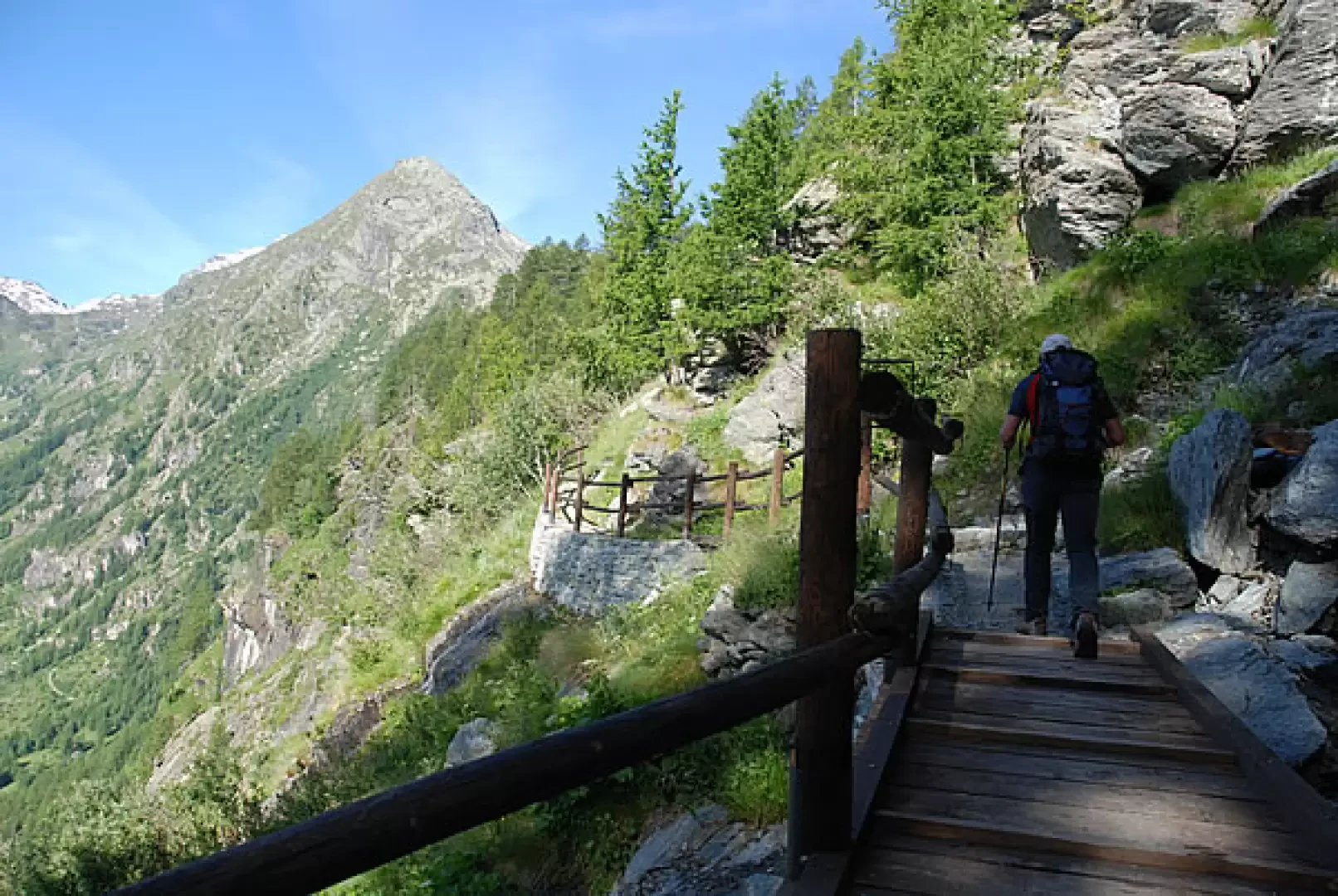 Risalire il crinale lungo la bella mulattiera che prende rapidamente quota mentre il panorama si apre sul fondo della Valgrisenche e sul sottostante villaggio di Planaval. Si lasciano le ultime latifoglie, tra le quali qualche ciliegio selvatico (Prunus avium), e ci si addentra in un bosco di larici non molto fitto; il sentiero attraversa in cengia alcuni tratti di pendio scosceso, a tratti vi sono delle ringhiere di protezione, e risale a mezza costa su un selciato evidente e parzialmente scalinato attorniato da macchie di Ginepro (Juniperus communis L.).
