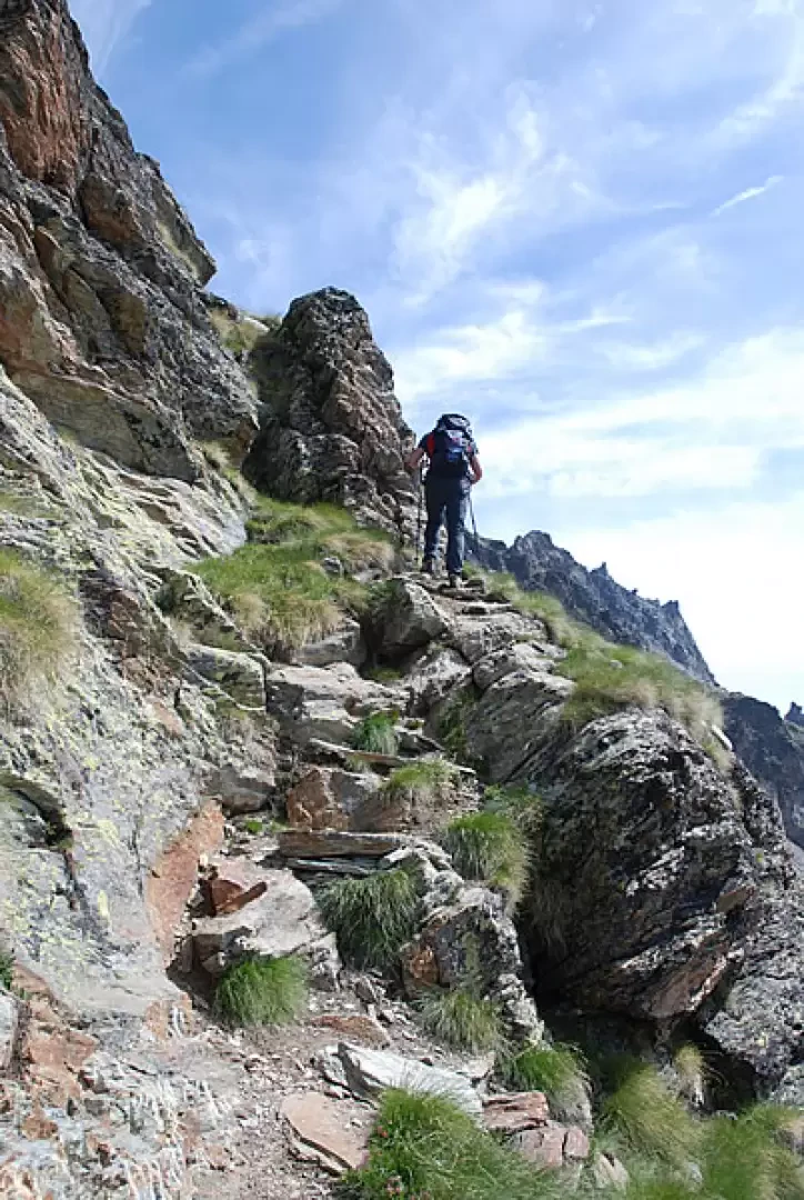 Superati gli alpeggi si incontra dopo pochi minuti il bivio per il Lac du Fond (21A): si svolta a destra e si risale il crinale, sulla bella mulattiera. Con una serie di svolte si raggiunge infine il Lac du Fond (2438 m, 2h15'). Dal lago ci si porta sul lato orientale e si riprende a salire sino ad incontrare un'ampa cengia. Il sentiero, ottimamente risistemato, inizia poi una lunga serie di piccoli tornanti che fanno prendere notevolmente quota, mentre al di sotto il lago si fa sempre più piccolo ed il Rutor emerge in tutto il suo splendore. Superato un piccolo tratto, leggermente esposto, a quota 2700m si incomincia a costeggiare i contrafforti rocciosi seguendo una diagonale verso destra sino a raggiungere un lungo traverso verso destra, pressoché pianeggiante. Si riprende a salire mentre è ormai in vista l'intaglio del colle. Si prosegue la salita lasciando sulla destra la maestosa guglia della Torre del Tighet (2976 m). Si risale l'ultimo tratto, sono presenti nevai ad inizio stagione, sino a raggiungere il Col de la Crosatie (2826 m, 3h15') ed il suo caratteristico ometto a piramide.
