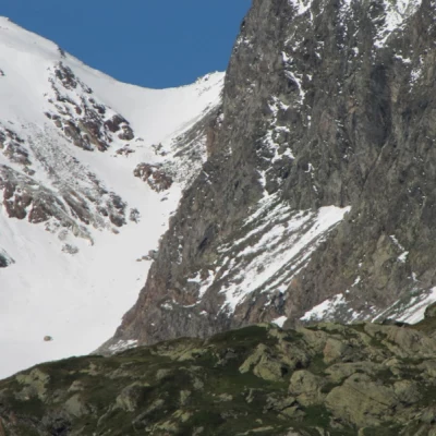 Si continua a seguire il sentiero lungo il lago, ma alla prima curva lo si abbandona per seguire una traccia che attraversa una pendio di sassi per poi perdersi quando il pendio diventa erboso.
