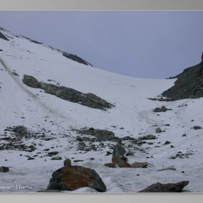 Superati gli alpeggi si incontra dopo pochi minuti il bivio per il Lac du Fond a a 0h15' di cammino (2438 m). Si prosegue sempre verso il Colle attraversando il torrente su di un passaggio facilitato da alcune pietre nel suo alveo e costeggiando la sua destra orografica; il tratto è pianeggiante e a tratti paludoso. Lentamente si risalgono le tracce di bestiame che portano su di una ampia cresta spartiacque: qui le mucche al pascolo ci fanno godere particolare suggestioni visive. Superato un lungo tratto pianeggiante si giunge all'attacco del colle: il sentiero muta struttura, da ampio e comodo incomincia a diventare più accidentato. Si incomincia a risalire la morena in direzione del Col Planaval; dopo un primo tratto di salita il sentiero spiana leggermente, qui si incontra una sorgente (2450 m ca), per poi riprendere a salire. Il tracciato non è più evidente ma con l'ausilio delle frecce gialle si riesce comunque a mantenere la rotta. Dopo circa 2h30' si aggira una grossa morena, la lasciamo sulla nostra destra, e ci si infila nel vallone che porta al colle. Ormai si è giunti nei pressi dell'attacco del colle: si attraversa un torrentello e ci si porta sulla sua sinistra orografica, si attraversa un tratto di rocce e detriti e finalmente si può vedere il tratto terminale dell'ascesa al colle. Si raggiunge la sommità della morena prima citata, durante il percorso si devono superare alcuni grossi massi, senza difficoltà, infine si attraversa un nevaio ed un piccolo torrentello formato dalle acque di fusione del ghiacciaio soprastante. Si raggiunge infine il ghiacciaio (2750 m), questo è il tratto più difficoltoso dell'intera escursione: si consiglia di mettere i ramponi anche se a volte sembra che la neve porti in quanto la pendenza della salita su ghiaccio è comunque non trascurabile.