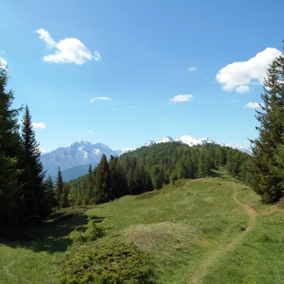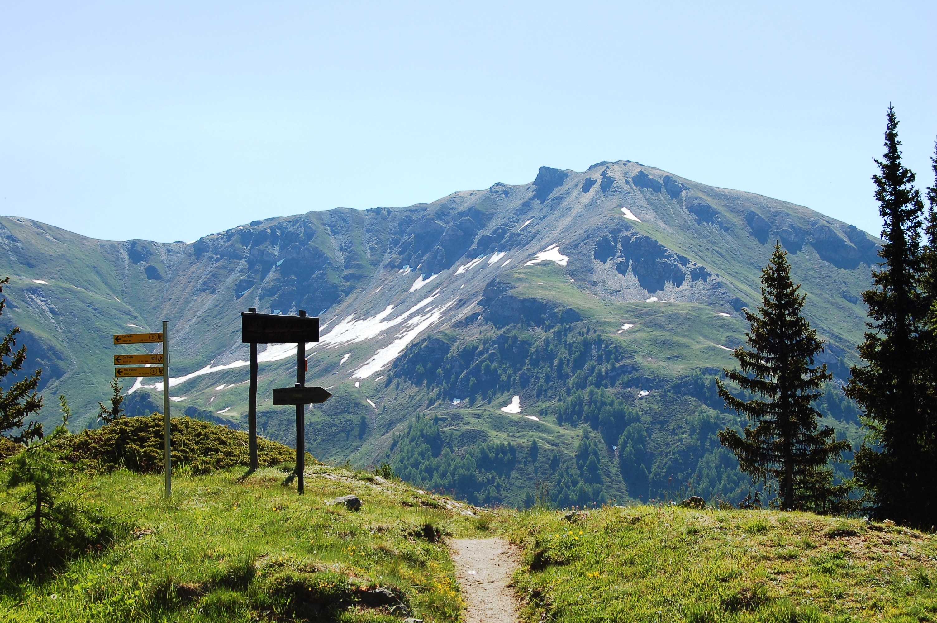 Si risale la strada poderale che ormai si inoltra nel folto bosco di abete e larice e raggiunge il villaggio di Arpilles (1882m, 0h45'): da qui diparte un sentiero che si inoltra a mezza costa nel bosco. Dopo un primo tratto abbastanza dolce, si inizia a risalire il crinale spartiacque con la comba di Vertosan; si procede nel bosco molto fitto dal quale ogni tanto si aprono interessanti squarci panoramici sulle cime che sovrastano l'envers di Morgex: dal Mont Paramont al Mont Crammont. Superata una radura, dalla quale partono altre tracce che puntano sul vertice del crinale che porta alla Punta Fetita, si prosegue sempre a mezza costa rientrando nel bosco. Dopo circa 15 minuti la traccia diventa più ripida e, con qualche tornante, prende quota. Successivamente si riprende a marciare senza eccessiva salita e, dopo 1h30', si raggiunge il Col de Bard (2179m): da quassù si può osservare la sottostante Comba di Vertosan. Si trascura il sentiero per la Punta Fetita e si prosegue verso destra puntando verso il Court de Bard in un ambiente veramente suggestivo. Si procede dapprima in leggera discesa e poi con una dolce salita verso la nostra meta: il panorama verso le cime circostanti è notevole, dalla Grivola al massiccio del Monte Bianco. Dopo circa mezzora di idillio si raggiunge la tozza cima del Court de Bard (2261m, 2h00').