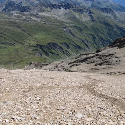 Lasciata a destra la capanna, si superano a sinistra dei dossi erbosi per portarsi a piedi del versante est della Grande Rochere per incontrare sulla sinistra la traccia con i primi ometti che superano un tratto erboso per poi passare su un tratto detritico a sinistra di un canalino.