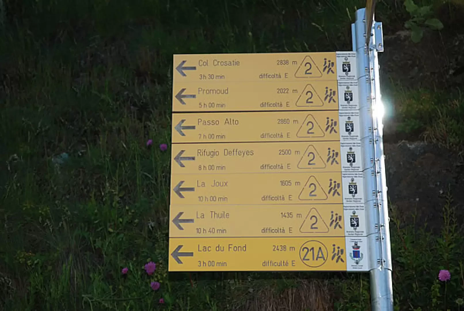 riportato a 3 ore di marcia. Dal pannello si attraversa un bellissimo tratto del vallone senza particolari pendenze in cui il torrente scorre placido: sicuramente un angolo poco conosciuto della Valle d'Aosta ma estremamente suggestivo.