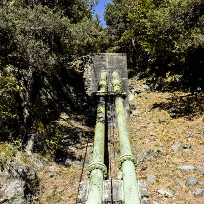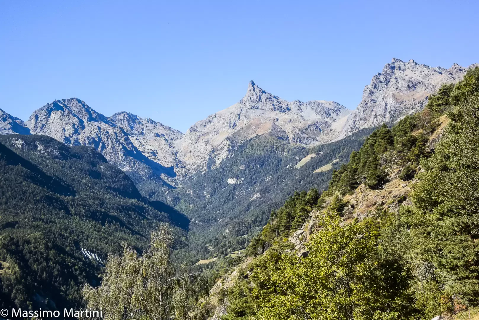 0h25' Attraversare la strada e riprendere il sentiero che taglia un tornante della strada per poi confluire nuovamente sulla stessa ed iniziare a risalirla seguendo una lunga serie di brevi tornanti. Al termine della successione di tornanti si esce dal bosco all'altezza della presa d'acqua della centrale idroelettrica (1145m): da apprezzare glisplendidi scorci sulla valle centrale e sull'inconfondile sagoma del Mont Avic. Proseguire sulla strada senza soluzione di continuità sino al caratteristico villaggio di Crestaz (1297m, 💧).