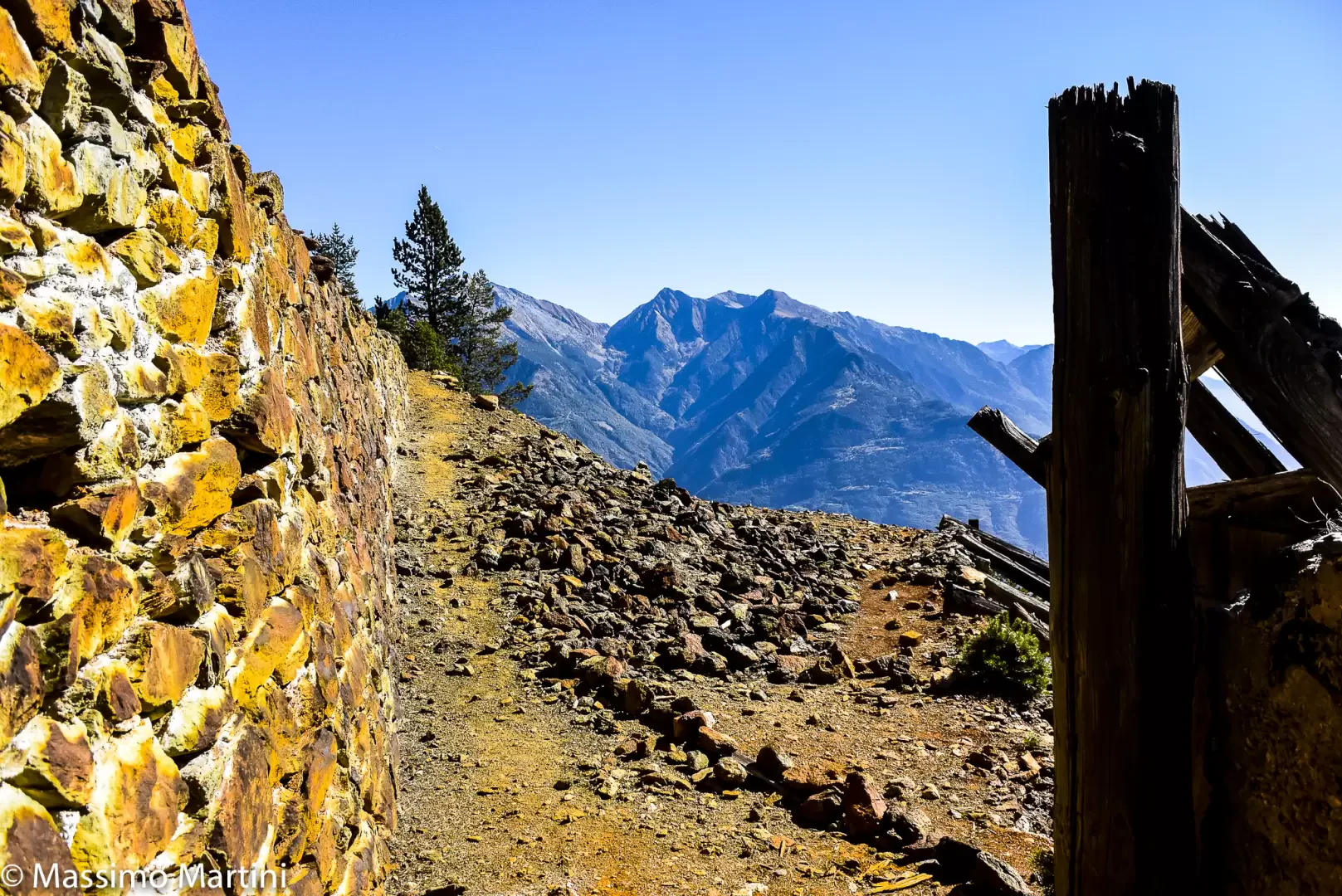 1h45' Se non si vuole soffermarsi per una breve visita al villaggio di Hérin, fontanile presente 💧, si prosegue seguendo le indicazioni della palina su di uno stradello prima asfaltato poi sterrato. Si vira a destra e si riprende il bosco, ora totalmente di conifere; si incontra la biforcazione tra i sentieri che conduce al Mont Barbeston, da trascurare, ed lo stradello che prosegue diritto in direzione della miniera. il bivio con il sentiero che dopo una curva a destra, con moderata salita raggiunge il sito minerario di Hérin (1596m) 2h15' .