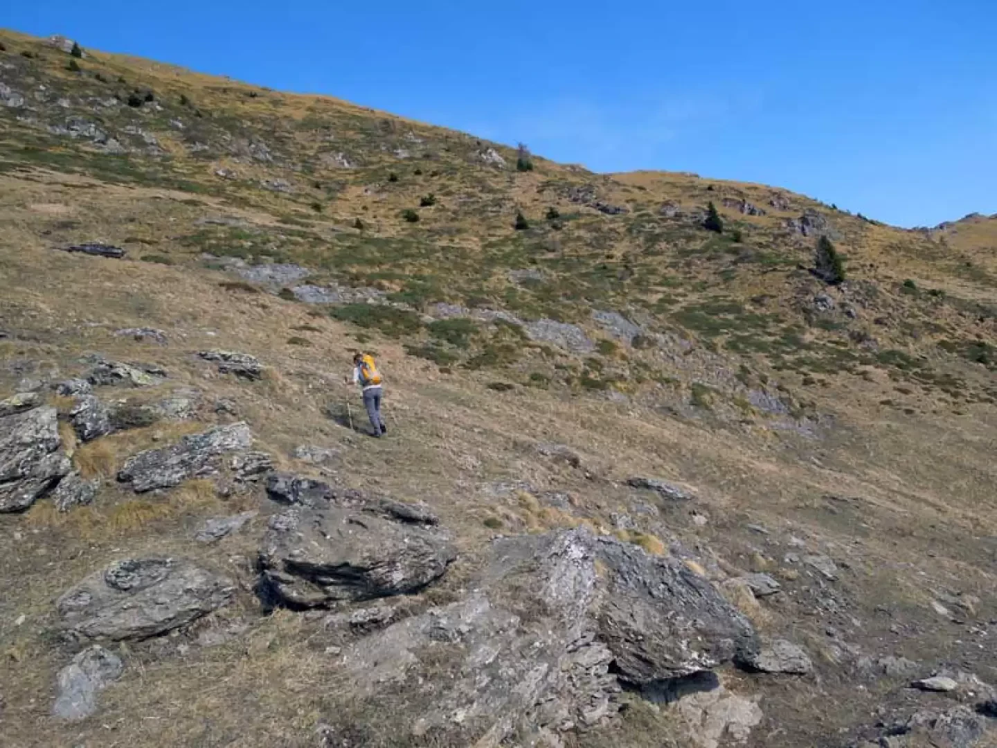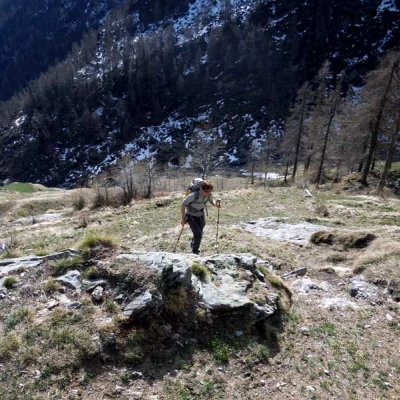 Il Mont Digny si trova sulla cresta montuosa che separa il vallone di Manda con la valle della Legna nella bassa Valle di Champorcher. E’ una modesta elevazione ma offre un bellissimo panorama sulle vicine vette del parco del Mont Avic e su quelle limitrofe; magnifico è poi il colpo d’occhio sul gruppo del Monte Rosa e del Cervino che ci viene offerto al raggiungimento della cresta; la presenza di camosci e cerbiatti completa poi il bel quadro ambientale dell’escursione. Il percorso, quasi tutto al di fuori del bosco, si snoda dapprima con poca pendenza sul fondo di un bel vallone passando per alcuni alpeggi e poi, diventando più ripido, risale ampi e panoramici pendii erbosi; non vi sono difficoltà tecniche se non il fatto di prestare molta attenzione nella progressione sui ripidi ed abbastanza esposti pendii finali di erba olina che ne sconsigliano la salita dopo le precipitazioni o comunque quando si presentasse bagnata. Descrizione Dallo slargo ci si indirizza verso le paline situate al suo termine nei pressi delle case e si inizia a camminare in leggera pendenza sul comodo sentiero affiancato dalla monorotaia di servizio per gli alpeggi superiori; si passa poi quasi subito dalle baite diroccate di Verney (1314 m), che si trovano alla nostra destra, da dove ci si alza, sul sentiero ora gradinato, arrivando successivamente ad un bivio (1388 m) al quale si lascia alla sinistra la traccia che segue la monorotaia e si sale per l’evidente mulattiera a destra. Compiuto un tornante si passa dalla baita di Frete (1413 m) e, dopo aver superato una cappelletta, si continua col percorso poco ripido che si inoltra nel vallone superando la baita di Boset desot (1531 m). Subito dopo si arriva ad un bivio (1566 m) dove si prosegue sul sentiero di destra che, senza eccessiva pendenza supera la baita di Boset damon lasciandola poco al di sotto di noi e con un bel tratto panoramico a mezzacosta giunge all’alpeggio di Bataille (1694 m) appena oltre il quale si trova un altro bivio in corrispondenza di una palina; svoltati a destra il sentiero diviene subito più ripido e, risalendo le balze erbose soprastanti, ci si ricongiunge con un’altra monorotaia che si segue per poco. Si continua sul percorso che con alcuni stretti e ripidi tornanti rimonta un largo sperone erboso per poi spostarsi sulla destra e, dopo aver superato un poco marcato impluvio, si sposta sulla costola erbosa alla destra; risalita faticosamente anche questa si arriva ben presto nei pressi della panoramica baita di Croset damon (1938 m) dalla quale, senza raggiungerla, si devia decisamente sulla destra verso i ripidi pendii di erba olina che scendono dalla fiancata della montagna. In questo tratto si deve individuare una labile traccia, seguita anche dagli animali, che taglia in leggera salita a mezzacosta gran parte della fiancata cercando poi il punto migliore per deviare alla sinistra e risalire con un ultimo ripido strappo verso un evidente colletto alla sinistra di una puntina rocciosa. Giunti in cresta, dove ci si trova davanti ad un eccezionale colpo d’occhio sul gruppo del Monte Rosa e del Cervino, il percorso diviene più semplice nel percorrere il comodo e mai esposto crinale che con qualche saliscendi ci fa pervenire sulla vetta. In discesa, se si vuole abbreviare un po’ il percorso e soprattutto con terreno asciutto, si possono eventualmente percorrere i ripidi pendii appena alla sinistra della punta sfruttando le balze erbose gradinate che in breve raggiungono la traccia di salita.