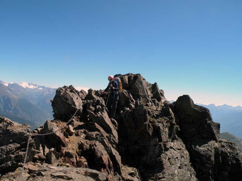 Percorrere la cresta finale, con qualche passaggio impegnativo ed esposto (in cui è necessario usare le mani in caso di difficoltà), rientrando comunque nel terreno dell'escursionismo. Al termine della cresta si raggiunge infine la vetta, dove sono erette una piccola edicola dedicata alla Madonna e una croce (3061m) 8,41km .