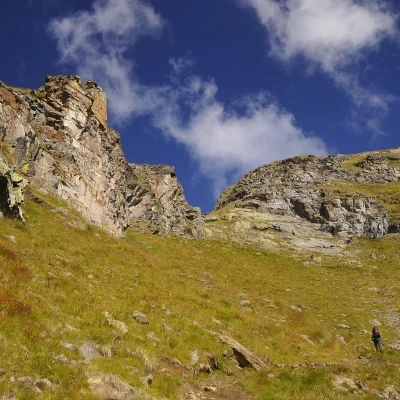 3h20' 6,91km Continuare con una serie di svolte sull'irto versante, dove il magro pascolo ha ormai lasciato spazio al classico ambiente detritico di alta quota, popolato solo da sparsi gruppi di capre selvatiche. Il sentiero volge a destra fino a raggiungere il Bivacco Alessandro Pansa (2983m), installato sui resti dell'antica Capanna Margherita.