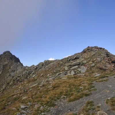 2h45' 6,07km Svoltare a destra e seguire il sentiero che, con discreta pendenza, inizia a risalire il versante meridionale della meta. Lungo il primo tratto di salita si possono apprezzare begli scorci sul sottostante Lac Fallère. Il sentiero si dirige verso una piccola costiera rocciosa, dopo la quale, con una serie di svolte, raggiunge un piccolo ripiano dove si congiunge con il sentiero proveniente da Bellun (1664m).