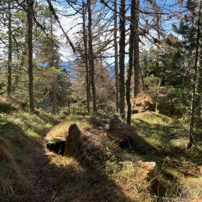1h45' Proseguire sul sentiero 3 indicato da una palina segnaletica lasciando a destra un caseggiato e, dopo aver virato a sinistra, si risale il pendio boscoso su comodo sentiero sino a raggiungere l'innesto con il sentiero 107 della Gran Balconata del Cervino, indicato da una palina segnaletica.