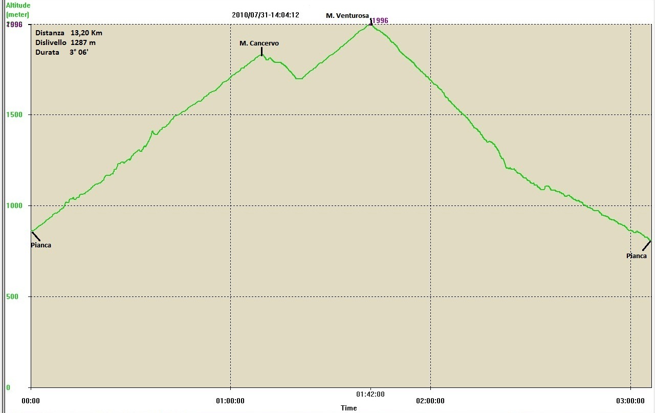 Parcheggiata l’auto a Pianca si prosegue brevemente sulla strada asfaltata trovando ben presto sulla destra l’indicazione del sentiero (su un sasso, e piuttosto sbiadita). Il sentiero è contrassegnato anche con bandierine rosso-bianco-rosse. Si risalgono i prati sovrastanti il paese, si costeggiano alcuni capanni e si giunge a una grande roccia a tettoia. Si prosegue sul sentiero che salendo si porta sotto le ripide bastionate fino ad arrivare ad un belvedere con croce di legno. Ci si inoltra ora in una stretta e ripida vallecola aggirando dapprima un torrione roccioso e continuando in faticosa salita per raggiungere un tratto di roccette, un po’ esposto ma ben assicurato con catene (Pass Catif). Si sale ancora su ripido sentiero a zigzag e si raggiungono infine i pascoli superiori in un ambiente ameno di prati, roccette calcaree e boschi di faggio. Un bivio segnala a sinistra il sentiero 102 per la baita Cancervo e a destra il sentiero diretto. Entrambi i percorsi portano alla meta. Girando a destra, in leggera salita, si entra in una faggeta e successivamente lievi sali-scedi su prato conducono comunque alla baita Cancervo. Seguendo le tracce del sentiero si risalgono i prati e dossi coperti di mughi e roccette calcaree fino a intravvedere sulla destra, tra gli alberi, la croce di vetta. 1835 metri, ore 2:45. Dalla vetta del monte Cancervo seguire la traccia che scende a nord-ovest costeggiando i pini mughi e raggiungere il sentiero segnatissimo che si abbassa a zig zag scendendo al passo Grialeggio (1707 m). Da qui riparte il sentiero 102 diretto al monte Venturosa, bella piramide a nord del mone Cancervo. Seguendo i segni rossi, sbiaditi ma visibili, si percorre la dorsale su terreno ripido ma agevole. Ad un certo punto, poco prima della baita Venturosa, seguire i bolli rossi (102 scritto su un sasso) e portarsi a sinistra della dorsale, verso la direzione del passo Baciamorti. In un ambiente solitario e selvaggio si raggiunge una costruzione in pietra su cui sono indicate le direzioni per il passo Baciamorti a sinistra e per il mone Venturosa avanti dritto. Si prosegue risalendo la ripida conca sotto la vetta e ci si porta su un colle sotto la cresta. Svoltando a destra si segue la dorsale dapprima su un tratto di sentiero esposto e successivamente sempre più roccioso fino alla croce di vetta. 1999 metri, 45 minuti dal passo Grialeggio. La discesa si compie scendendo in direzione della baita Venturosa, il cui tetto verde è ben visibile dalla cima. Il sentiero è agevole su prato e con pendenza moderata. Dalla baita scendere fino a incontrare il bivio con il sentiero 102 e scendere quindi fino al passo Grialeggio. Da qui si scende nel vallone a sinistra su sentiero ben evidente che entra in una faggeta e con ampie svolte scende fino a raggiungere la Baita della Vecchia (1380 m) e in poco tempo alla strada asfaltata. Bisogna ora percorrere quasi tre chilometri di asfalto, passando dall’abitato di Brembella, per tornare a Pianca.