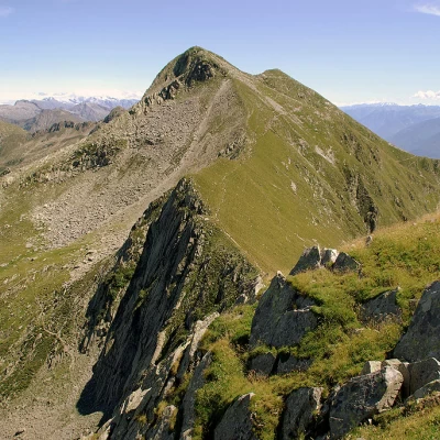 Dalla spianata de "Il Giovo", ignorando le numerose paline di indicazione, si imbocca una traccia nel pascolo che, per la linea di massima pendenza, risale il dosso arrotondato parallelamente ad una linea elettrica. Giunti sul largo crinale, che coincide col confine di Stato - qualche cippo -lo si segue verso nord con salita meno accentuata fino a giungere in vista di una chiesetta. Si tratta di San Jorio, posta poco a monte dell'omonimo Passo (2014m): sul lato italiano, qualche metro a valle, vediamo il Rifugio San Jorio; mentre dal lato elvetico si apre una vallata boscosa con qualche alpeggio. Scesi al Passo - una bocchetta sassosa e franosa con paline di indicazione verso itinerari svizzeri - si risale immediatamente sul versante opposto lungo una traccia poco visibile, molto ripida, rocciosa e con molti blocchi smossi: il percorso poco intuibile è comunque molto efficace per andare ad evitare difficoltà maggiori su terreno decisamente infido. Un ultimo traverso ghiaioso inclinato a valle in territorio italiano ci conduce a raggiungere una spianata a nicchia nel crinale che accoglie un rifugio (privato!) posto praticamente sul confine. Pochi metri alle spalle della ex caserma italiana si posiziona, ancora più vicina al confine, l'omologa costruzione svizzera, apparentemente ancora funzionante come magazzino logistico. Si torna sul filo di cresta e, fra blocchi accatastati, si arriva sulla Cima di Cugn (2237m): è il punto di convergenza fra Italia, Cantone Ticino e Cantone Grigioni. Da qui il panorama spazia dal Lago Maggiore con il gruppo del Monte Rosa alle vette poco conosciute della Mesolcina e ai monti del Màsino-Bregaglia. La prossima meta, Monte Marmontana (2316m) - tre cime, culminante la centrale - si raggiunge seguendo la cresta fra tracce confuse di animali al pascolo e blochi accatastati. Fare attenzione al versante svizzero perché precipita nel vuoto verticale per circa 200m (riferita presenza di vie d'arrampicata non pubblicate). La cima del Monte Marmontana, pur mantenendo le visuali accennate, apre il panorama anche verso l'alto Lago di Como e la Valtellina. Per la discesa conviene percorrere senza traccia il pascolo molto ripido della cima orientale fino a portarsi poco sopra l'altezza del Rifugio San Jorio: qui si trova un sentiero sassoso ma marcato che conduce alla pista selciata di normale accesso al rifugio. La si segue lungamente a mezzacosta in direzione del visibile Rifugio Il Giovo, proprio in corrispondenza del parcheggio.