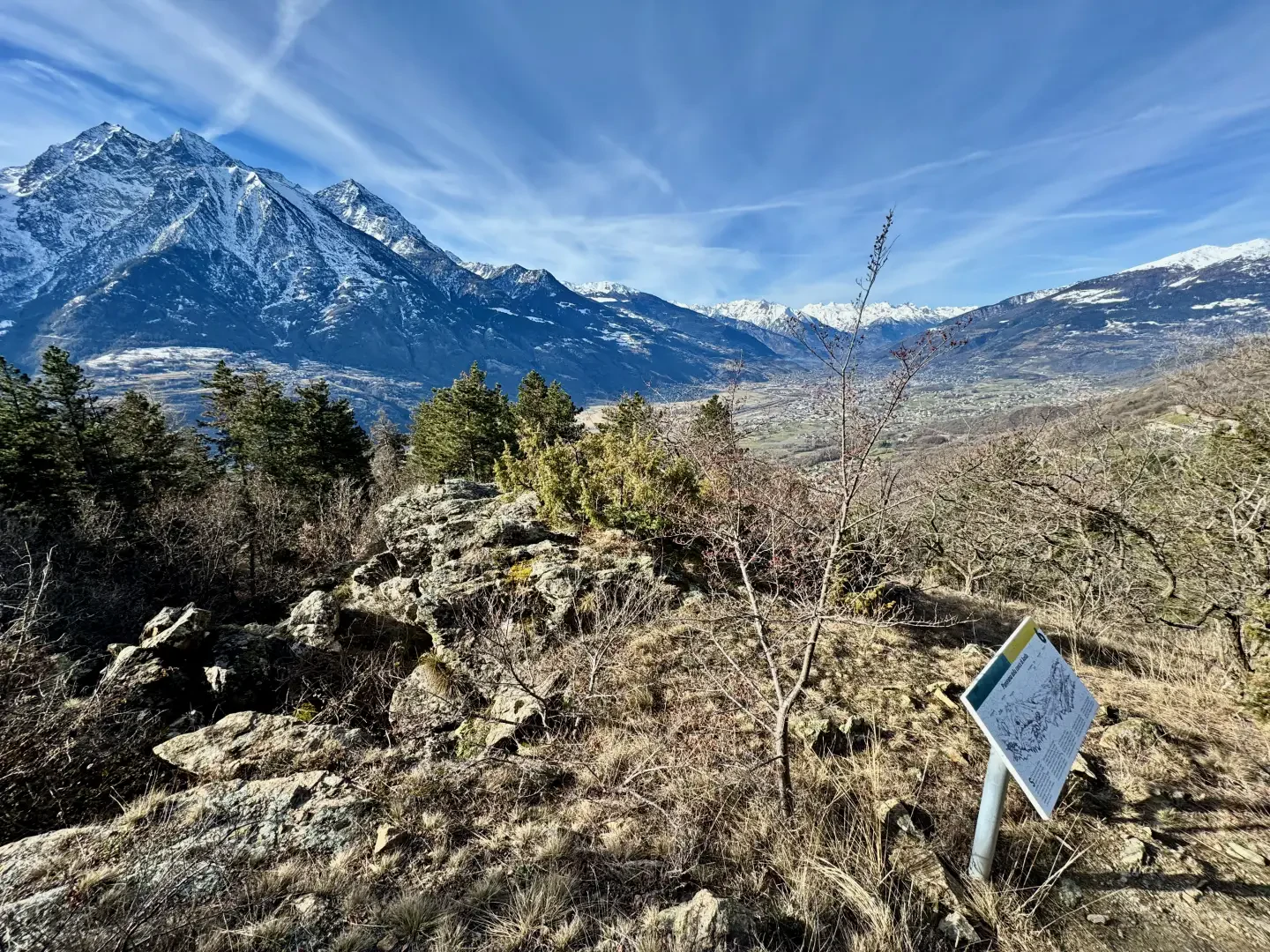 0h05' 0,36km 22m 9m 7 Prendere il sentiero sulla sinistra, che sale con pendenza costante lungo un versante inizialmente brullo, caratterizzato da arbusti sparsi e praterie alpine. Dopo alcuni tornanti, uscire dalla rada vegetazione e raggiungere un punto panoramico con vista sul Castello di Quart, dove si trovano una panca in legno e un pannello esplicativo sulla storia del castello. Dopo una breve sosta, proseguire lungo il sentiero che vira a destra, mantenendosi sulla sinistra orografica del Vallon du Château de Quart. Lungo il percorso, si possono osservare la roverella (Quercus pubescens) e il ginepro (Juniperus communis L.), specie tipiche degli ambienti xerotermici. Alcune svolte affievoliscono la pendenza, permettendo di raggiungere un masso solitario con coppelle preistoriche e incisioni rupestri risalenti all’Età del Bronzo. Accanto, è presente un secondo pannello informativo dedicato alle Fabriques, antiche strutture ben visibili di fronte.