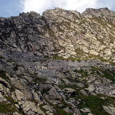 1h50' Rientrati sui proprio passi alla stazione della seggiovia (2160m) si risale con la mulattiera (segnavia [281cai] - Sentiero della Pace - realizzata durante la Prima Guerra Mondiale) un dosso di erba, rocce e qualche abete fino a raggiungere un pianoro. Aggirata a destra la conca, si rimonta un altro dosso e ci si affaccia ad un secondo lungo pianoro da costeggiare sulla sinistra. La mulattiera risale una zona a rocce montonate, procede fra erba, massi e detriti e si porta alla sinistra di fortificazioni militari. Segue un tratto a sinistra quasi pianeggiante fino ad una caverna militare poi, a saliscendi, si raggiunge un'altra zona a rocce montonate e si continua fino a valicare la selletta di erba e sassi che precede un laghetto e il Passo del Paradiso (o del Monticello) (2573m, 3h00'), dove è anche l'arrivo della telecabina Passo del Paradiso.