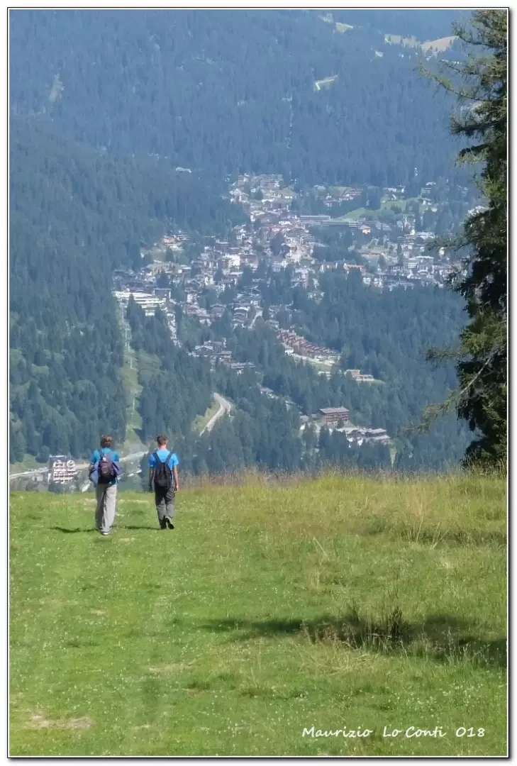 Con l’impianto si sale a Pra Rodont 1530 m, immerso nel verde degli abeti e dei larici e circondato da un vasto prato (e molto piacevole riposarsi su una delle tante sdraio disponibili...). Con il secondo troncone si arriva in cima al Doss del Sabion 2101m. Tra le diverse opzioni possibili, si sceglie di dirigersi verso il Monte Grual con vista dall’alto sulla la Casina di Valagola e il Lago Valagola, posto a 1600 m. Si arriva da una pista da sci e invece che seguire le indicazioni che suggeriscono di scendere a sinistra si va destra per giungere in cima al Monte Grual 1959 m. Qui, sempre usando la pista, si scende avendo davanti Madonna di Campiglio. Si raggiunge così la località Poza dei Fò 1660 m 1h15 (con 2 impianti aperti nel periodo invernale) e usando la strada forestale si recupera qualche metro di quota. Ad un bivio, si ignora la deviazione a sinistra per Malga Cioca e si continua a destra. Ad altri bivi, si va dritti con panorama su quella che dovrebbe essere la Val Nambrone. In breve, si ritorna a Pra Rodont (1h)