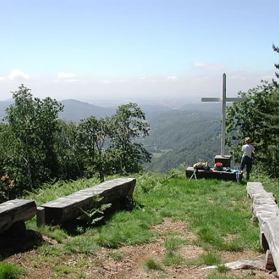 All'inizio dell'interpoderale una tabella con tempi e cartina (780m), illustra una delle tappe della GtB (Grande Traversata Biellese), il cui percorso é in parte comune al nostro itinerario. Saliamo dolcemente lungo la strada, con fondo di cemento, mentre sotto di noi sfilano vecchie cascine, alcune ristrutturate e abitate, mentre oltre le radure si apre il panorama sui paesini sottostanti e sull'altro lato della valle, Oneglie, il Cucco, Riabella, il Santuario di San Giovanni d'Andorno, e in alto il colle della Vecchia, riconoscibile perché a forma di V. Si cammina quasi sempre sotto gli alberi, e ad un certo punto si lascia la strada, che devia a destra, e si segue il segno giallo della tappa 54 della GTB, anche marcato Sentiero E85, che prosegue sullo sterrato diritto davanti a noi. Raggiunte un gruppo di baite in pietra, proseguire sul sentiero che sale a destra, dietro le baite, scendere sul prato e inoltrarsi nel bosco, attraversando un ruscello. Continuare passando daventi alle cascine Naulito (869m), riconoscibili per via di un affresco raffigurante una Madonna. Il sentiero si allarga e diviene sterrato, che scende decisamente fino a portarsi a ridosso delle case di Rialmosso (800m) 💧, costeggiando un muro, passando davanti un bellissimo lavatoio, poi nel paesino; proseguire per un po' tra le case e imboccare a destra una scalinata marcata con una freccia rosso sbiadito, quasi rosa, che sale a gradoni fino a trasformarsi in una bella mulattiera che ad un certo punto, nei pressi di una cappellina sulla quale, in basso, sono indicati il percorso e i punti cardinali, fa una bella inversione e cambia direzione di marcia, sempre sotto gli alberi, per lo più faggi. Seguiamo l'indicazione San Grato Pessine. Si sale nel bosco e si continua ad attraversare verso sud est, passando davanti a vecchie baite, fino a che davanti a noi l'orizzonte si fa più luminoso ed un ultimo cartello ad una deviazione i cui sentieri portano entrambe a San Grato 💧, ci conferma che siamo sulla giusta via; infatti la chiesetta è a pochi metri, in una posizione panoramica. Appena arrivati, c'è una bella fonte di acqua fresca. Intorno alla chiesetta ci sono numerose panche in legno, e verso ovest una croce dai pressi della quale il panorama è molto esteso (1003m, 1h30').