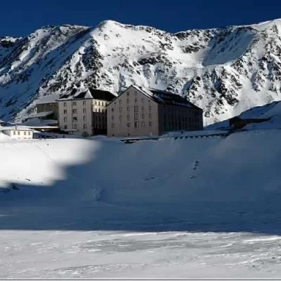 Si raggiunge l'Albergo Italia e si incontra nuovamente la strada: si svolta a sinistra e la si percorre sino all'Ospizio (2473m, 2h45').