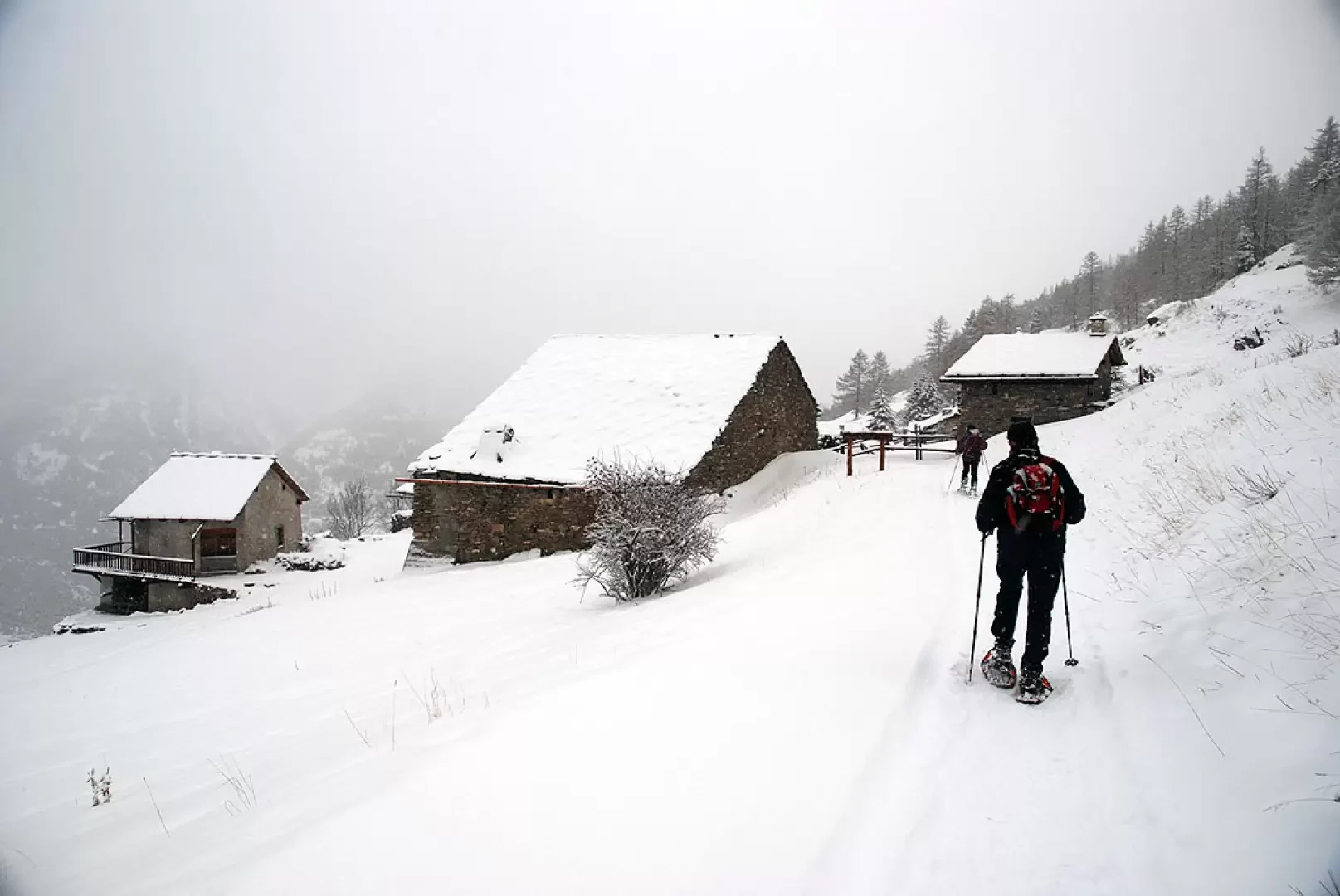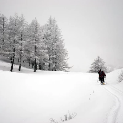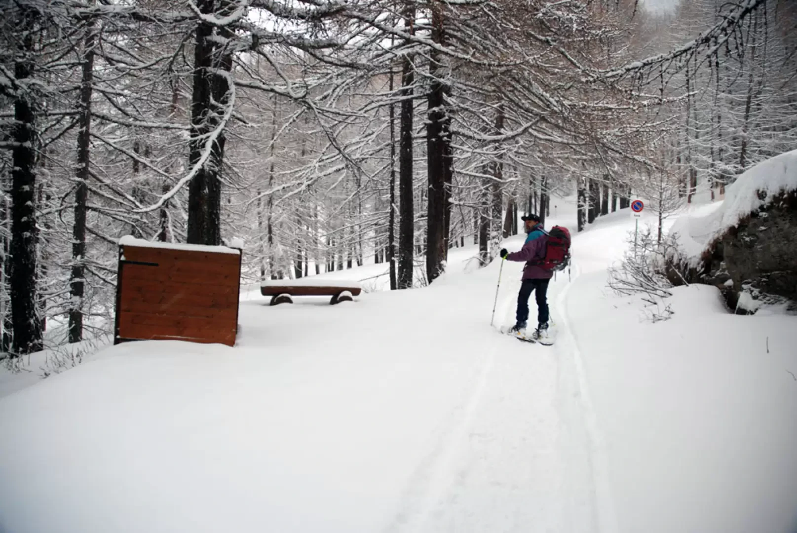 Lasciata l'auto ci si incammina sulla pista innevata, normalmente battuta dai gestori del rifugio. Si risale un vialetto che si inoltra nel bosco ed inizia a salire per un breve tratto sino a raggiungere il parcheggio estivo di Serre Blanche (1728m, 0h15'), l'ingresso del Parco Naturale del Gran Bosco di Salbertrand e la sbarra che di fatto impedisce l'accesso ai mezzi non autorizzati. Si prosegue sulla stradina innevata che inizia a risalire il bosco; si aggira il poggio di Serre Gountard (1800m) con un'ampia curva verso destra sino ad incontrare la deviazione per l'Alpeggio Randuin (1750m): si trascura il sentiero G10 e si prosegue sulla stradina a destra. Si supera un breve dislivello con un paio di comodi tornanti confluendo su di una radura ed incontrando il sentiero G6 che permette un più rapido rientro a Monfol. Ovviamente si prosegue diritti entrando nel Bosco La Sella; la stradina risale il bosco che spesso regala interessanti incontri faunistici. Dopo la breve salita si incontra una biforcazione: si segue la pista verso sinistra seguendo le indicazioni per Montagne Seu, trascurando la stradina che sale diritta verso Bergier - Assietta. La pista spiana leggermente e si addentra nel Gran Bosco: l'atmosfera di questo luogo è veramente magica! Si segue l'orografia degli impluvi del Rivo Outrettes e del Rivo Gorge superati grazie a comodi ponticelli in pietra. Si raggiunge il punto culminante del percorso e si inizia a discendere lentamente sino a confluire sui pascoli che precedono la meta finale. Prima del villaggio si incontra il bivio per gli alpeggi Le Selle, si trascura la pista a destra, e si prosegue raggiungendo le prime case di Montagne Seu: entrando nel villaggio si incontra la Gta e, poco dopo, il Rifugio Daniele Arlaud (1771m, 1h45').