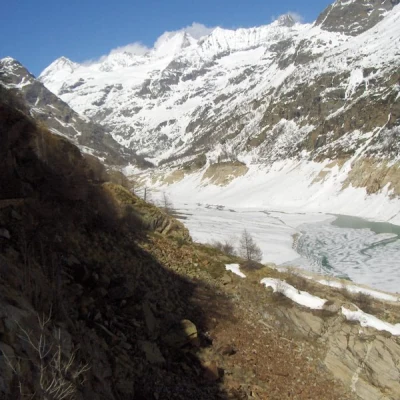 Dall'autostrada , uscita Aosta est, direzione Gran San Bernardo, deviazione per Valpelline, Ollomont, Bionaz e quindi Diga di Place Moulin, parcheggiare a lato diga (comodo parcheggio).