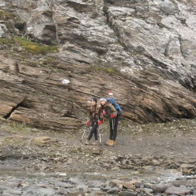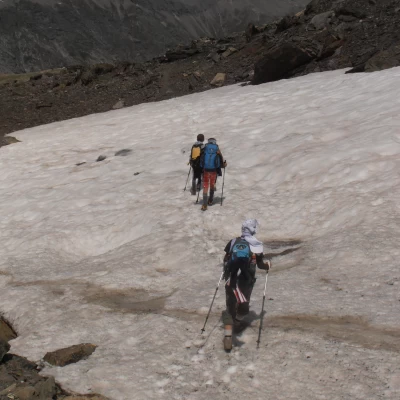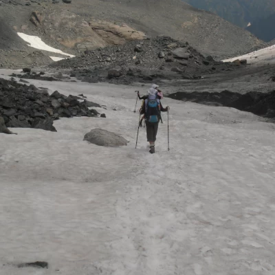 Tour della Bessanese 1 Tappa : R. Gastaldi, Lago della Rossa, Colle Altare, R. Cibrario. Dislivello: 550 m. in salita, 600 m. in discesa Durata: 3,5/4 ore Distanza: 7,5 Km Seguire il sentiero che parte dal rifugio e scende a S verso l'uscita della conca del Crot del Ciaussine, in direzione di una cascatella formata dal rio che scende dalla conca sottostante la Cresta Del Fort. Attraversato il torrente che scorre nel piano, il sentiero sale percorrendo il pendio erboso e detritico tra la cascata e le pareti di Rocca Affinau. Dopo una breve salita, si arriva al bivio per il colle d’Arnas; la traccia del Tour ignora questa indicazione e segue le tracce di sinistra che aggirano Rocca Affinau mantenendosi nel vallone alla sua sinistra (direzione S e poi SO). Con alcune ripide svolte, con lo sfondo della vetta della Croce Rossa, il sentiero porta ad una conca dove s’incontrano alcuni laghetti di fusione, raggiunti i ripidi pendii detritici che chiudono a sud la conca, una breve traccia ben segnalata, li risale con una diagonale verso sinistra portando direttamente al Collarin d’Arnas (2850); ottimo punto panoramico impreziosito dal vicino laghetto del Collarin. Il sentiero prosegue obliquamente in direzione S verso il Lago della Rossa; la discesa avviene su rocce montonate sino a raggiungere la diga (2690 mt.). Poco prima della diga, sulla sinistra del sentiero sorge il confortevole bivacco San Camillo, che dispone di venti posti letto. Attraversare la diga, seguire lo sterrato che circonda il lago e poi voltare a sinistra. Guadare un ruscello su delle pietre scistose e riprendere il percorso sulla sulla lato sinistro idrografico e procedere verso il fondo della conca glaciale. Salire una rampa che comincia all’altezza di una cascatella e che, con un facile percorso, conduce al colle Altare (2962 mt.). Dal colle seguire verso SE la traccia che porta ad un evidente e ampio canale nel quale, mantenendosi sempre sul lato destro e alternando falsopiani a ripidi pendii si scende ad un pianoro costellato di pozze d’acqua e delimitato in direzione ovest dal Lago di Peraciaval. Il sentiero ben segnato prosegue in direzione S, attraversa il ripiano e si porta sopra alla balza che domina il lato nord del Piano del Sabiunin, da dove, con pochi ripidi tornanti si raggiunge il Rifugio Cibrario. 2 Tappa: Rifugio Cibrario, Colle Sulè, Colle Autaret, Vallone della Lombarda, Rifugio Avérole Dislivello : 900 m. di salita, 1300 m. di discesa Durata : 6 -7 ore Distanza : 15 Km Dal Rifugio si attraversa in direzione ovest il Pian dei Sabiunin per raggiungere la morena dove ha inizio la ripida traccia che risale verso Sud i 300 mt di dislivello che portano al bacino glaciale di quello che fu il ghiacciaio Bertà (2900 mt.), ormai ridotto anch’esso ad una morena solcata da rari nevai. Con un percorso in leggerissima salita si percorre il piano mantenendosi a ridosso delle balze rocciose che scendono da Testa Sula.; alcune svolte portano direttamente al Colle Sulè (3073 m.) dal quale, guardando a O, sono ben visibili la forma triangolare di Point Costan con il colle d’Autaret alla sua destra ed il valloncello, dove scorre l’emissario dei laghi orientali di Autaret, nel quale si svolge la parte intermedia del percorso. Dal colle la traccia scende su un ripido pendio di sfasciumi per circa 100 m.; la pendenza quindi degrada e si prosegue su pietraia sino a quota 2800 circa dove, nei pressi di un masso ben visibile, si abbandona il sentiero che scende a Colle Spiol e si risale (palo indicatore) per circa 30 m. verso un colletto oltre il quale si trova un laghetto di fusione. Aggirare la pozza sul lato sinistro su comode balze e proseguire, sempre in direzione O, su tratti erbosi per poi svoltare a S per tracce di sentiero sino ad incrociare un evidente mulattiera militare lastricata. Risalire verso destra la mulattiera in direzione O sino ad una dorsale dalla quale è visibile un laghetto presso il quale si nota il nudo edificio dell’ex rifugio Moise, una vecchia casermetta della guardia di frontiera. Dal retro dell’edificio si prosegue con evidente mulattiera verso i laghi orientali che si lasciano a distanza sulla destra. All’altezza dell’emissario del lago occidentale di Autaret si incrocia il sentiero proveniente da Malciaussia. Proseguire su sfasciumi sino a raggiungere il Colle dell'Autaret (3072 m). Dal Colle scendere il ripido fronte morenico con una diagonale in direzione N e proseguire con pendenza costante a mezza costa fino ad incrociare il Torrent de la Lombard che si attraversa grazie ad un comodo passaggio su tubi di cemento. (2530 m ). Proseguire sulla riva sinistra orografica sino a quota 2450 dove, poco prima della Cabane des Bergers, il percorso svolta a destra abbandonando il sentiero principale per scendere in direzione di una passerella che riporta sulla sponda destra del torrente. Passato il ponte, il sentiero sale leggermente sino al Pas de la Mule da cui ridiscende al Plan de Revallon in direzione del già visibile Refuge d’Averole che si raggiunge in pochi minuti risalendo il pendio sino ad incrociare il sentiero del Col d'Arnès del quale si percorrono verso sinistra gli ultimi metri.. 3 Tappa : Rifugio Avérole, Passo del Collerin, Ghiacciaio di Pian Gias, Rifugio Gastaldi. Dislivello: m. 1100 di salita e m. 650 di discesa Durata: 5/6 ore Distanza: 9 Km Il sentiero inizia dietro al Refuge d’Avérole, dove si trovano i ruderi della vecchia costruzione, e risale in direzione NE il pendio erboso superando con ripide svolte una balza oltre la quale si avvicina alla destra orografica del rio Ruisseau du Veillet che segue fin verso quota 2600 dove, all’altezza di una morena frontale ben evidente, piega verso destra attraversandolo. Il sentiero prosegue in direzione E-NE e risale la morena sino a raggiungere una piccola balza di gradoni rocciosi (mt 2850) dove, puntando a N ripassa sulla riva destra del torrente; quest’attraversamento può richiedere qualche attenz